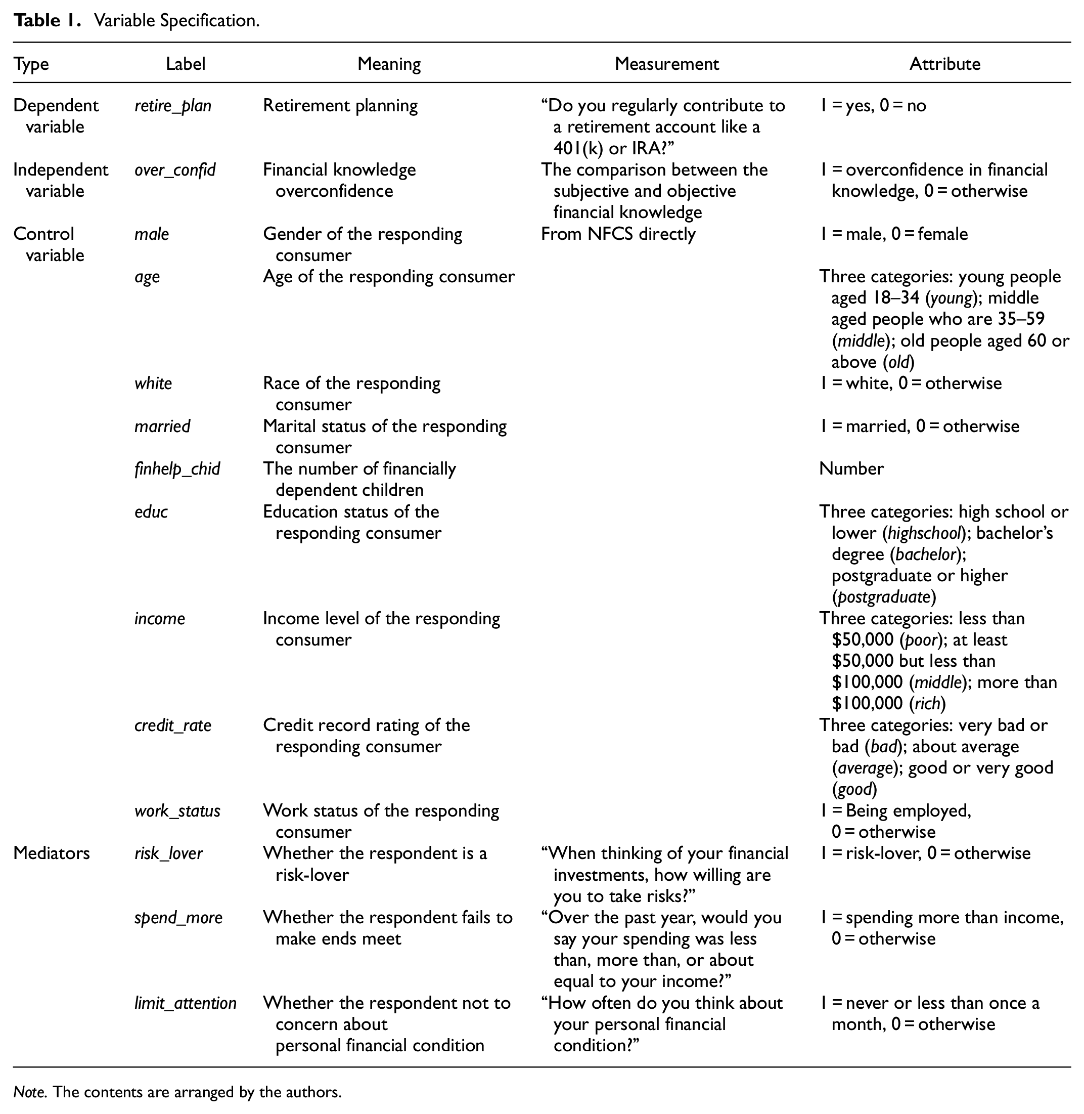Using the National Financial Capability Study (NFCS) from 2012, 2015, 2018, and 2021, this study investigates the relationship between overconfident financial knowledge and consumer retirement planning. Compared to existing studies, this study has contributions in three aspects. First, this study explores the mediators in this process, which helps to gain a more comprehensive theoretical understanding of the financial knowledge-financial behavior framework. Although previous studies reached a consensus conclusion that overconfident financial knowledge is not conducive to formulating specific retirement planning (Anderson et al., 2017), few of them delve into the potential mediators, which fails to answer why overconfident financial knowledge decreases the probability of retirement planning.