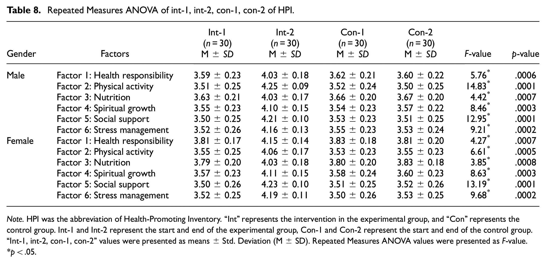 HPI’s “int-1, int-2, con-1, con-2” repeated measures ANOVA, and the overall data were shown in Table 8. It was found that after 8 week of aerobic fitness exercise program intervention in the male and female experimental groups, “int-2” was better than “int-1, con-1, con-2” for both males and females. Moreover, the male experimental group had the most significant difference in physical activity (