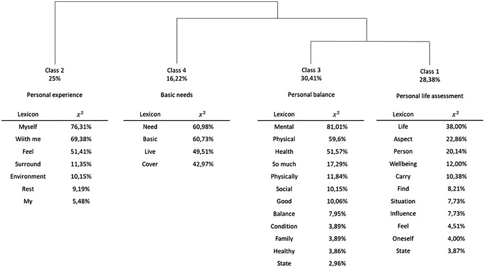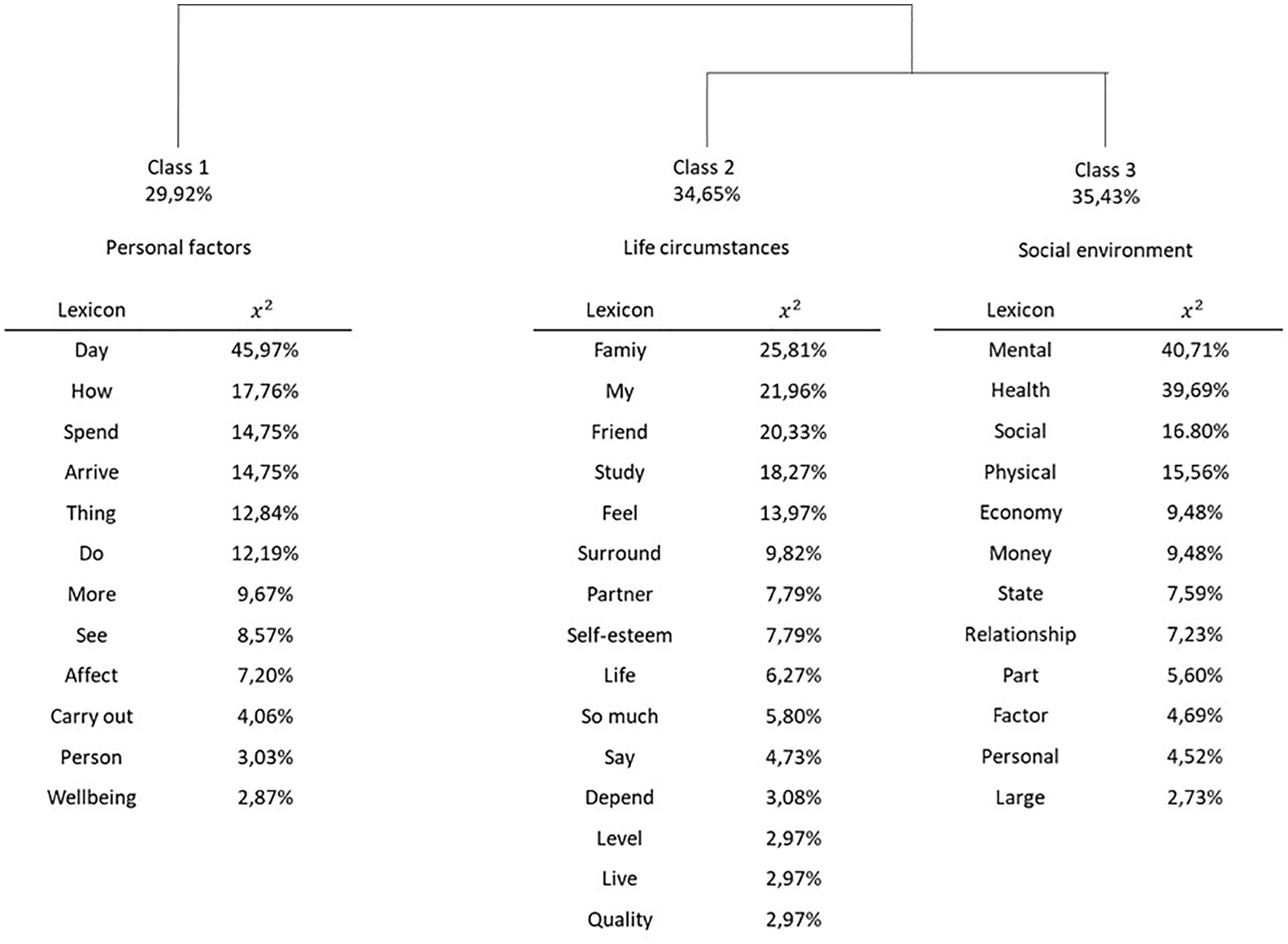 The second class was named “Life circumstances” (34.65% of text segments) and is characterized by contributions such as: “my well-being depends on my health, the health of those around me, and that all needs are met, both mine and those of my family and friends” (χ2 = 25.81); “on my social relationships, self-esteem, level of fatigue, my family and friends” (χ2 = 20.33); “health, friends, family, studies, work life, love life” (χ2 = 18.27).