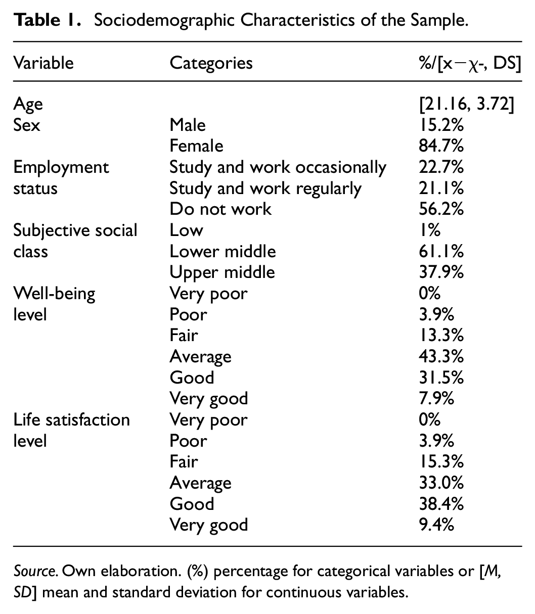 A total of 203 students from the Autonomous University of Madrid and the University of Las Palmas de Gran Canaria participated in the study. Table 1 presents the sample characteristics, characterized by being female (84.7%), with a mean age of 21.16 years, not employed (56.2%), and from a lower middle-class background (61.1%). Additionally, as shown in the table, two ad hoc categorical variables were included to ask the participants about their subjective levels of well-being and life satisfaction. This approach allowed us to assess those participants reported moderate well-being overall, with higher life satisfaction scores (43.3% indicating a moderate level of well-being vs. 38.4% with higher life satisfaction).