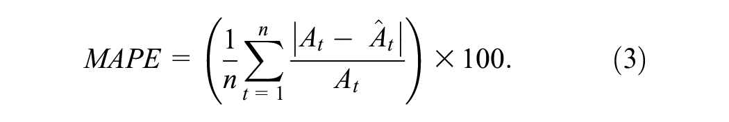 After training prediction models, the mean absolute percentage error (MAPE) is used as a performance measure to evaluate the performance of prediction models. The MAPE, used in comparing prediction models (Ahlburg, 1982), has also been widely used to measure prediction models’ accuracy (Kuan, Leu, Lin, & Lee, 2022; Ou, 2012). When the value of the MAPE is lower, the prediction ability is better. The definition of the MAPE is in Equations (3), where