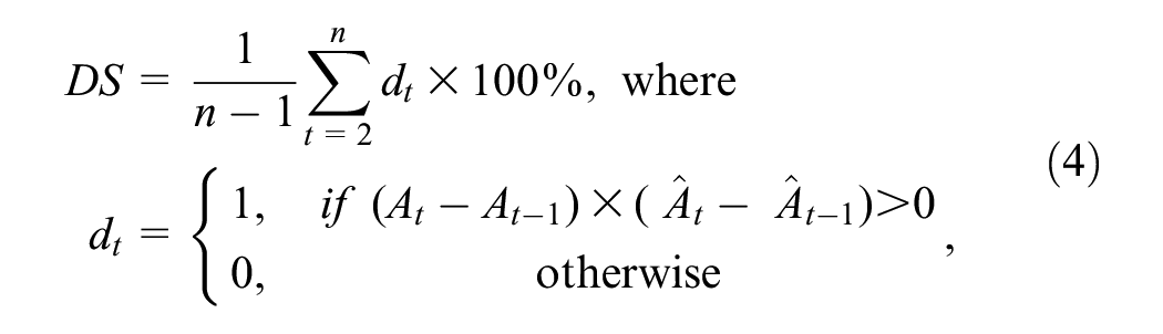 In addition to using the MAPE to verify the prediction accuracy of the models, this study also measures the coincidence in the prediction direction trends between the predicted and the actual values by using directional symmetry (DS; Kuan, Leu, Lin, & Lee, 2022). The definition of DS is defined as in Equation (4):