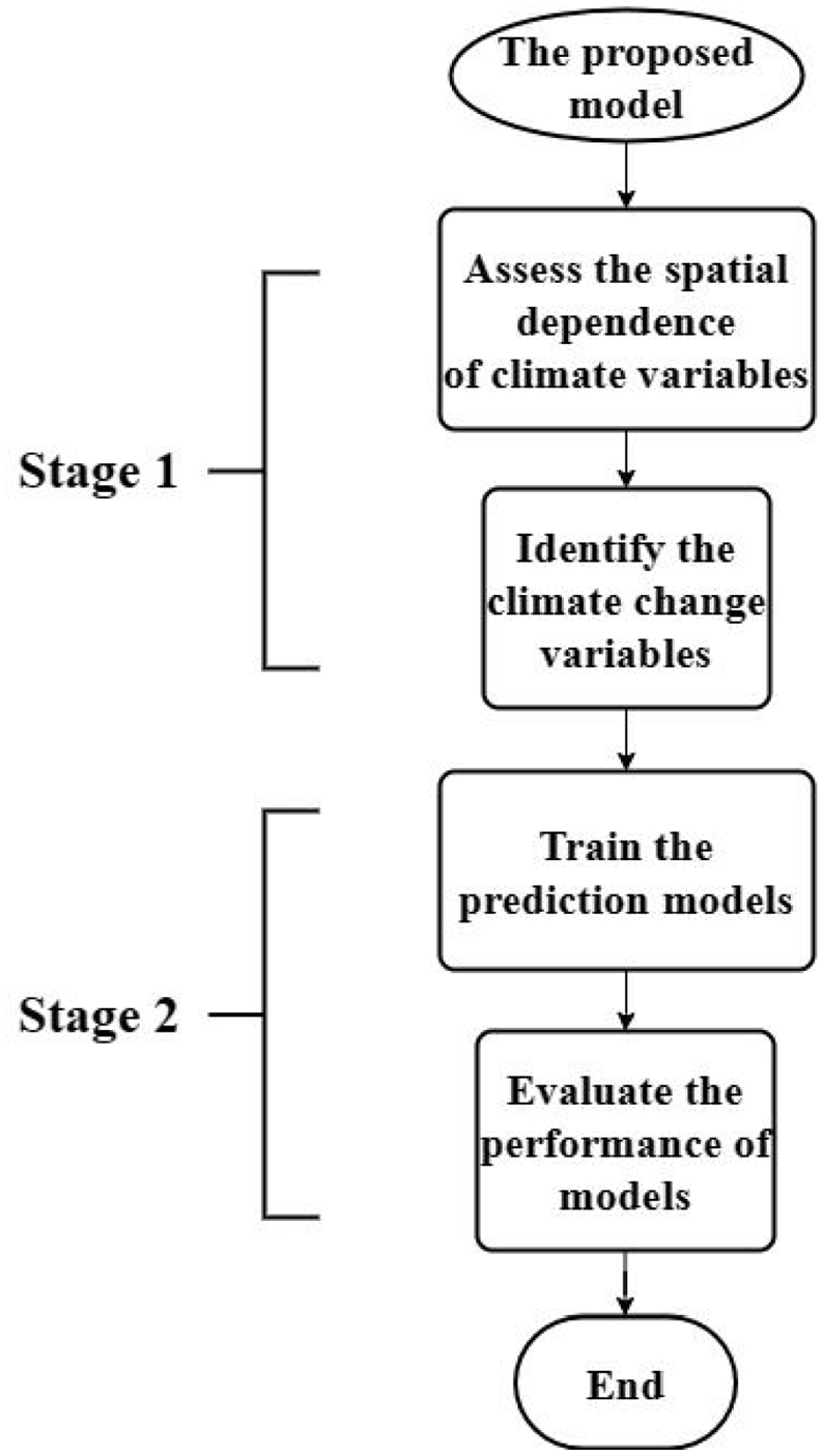 As outlined in the Introduction, the main objective of this study is to propose a hybrid prediction model that integrates spatial analysis to assess the effect of climate change on rice yield. The proposed model consists of two major stages to achieve the objectives: (a) assessing climate change across regions using spatial analysis and (b) predicting rice yield by using climate change variables. Figure 3 and the following sub-sections show the proposed model’s analysis procedure.