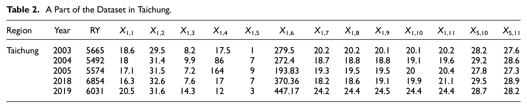 In the analysis process, these two datasets were combined. Table 1 presents an example subset of the dataset, while Table 2 outlines the variables, where RY denotes the rice yield for the first crop season, and X