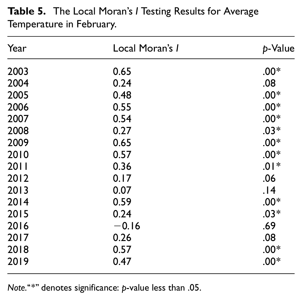 Table 5 presents an example of climate change variables selection. Agricultural experts noted that the average temperature in February was significant for nearly all years before 2012 but only about half of the years thereafter, indicating a shift in its spatial relationship. This indicates that the spatial relationship of average February temperatures has changed; therefore, it should be considered a variable of climate change. Based on the selection strategy, there are 19 climate variables selected, such as “avgtempFeb,”“maxtempFeb,”“mintempFe,”“rainmmFeb,”“raindayFeb,”“radiationFeb,”“mintempMar,”“radiationMar,”“maxtempApr,”“mintempApr,”“rainmmApr,”“radiationApr,”“maxtempMay,”“rainmmMay,”“radiationMay,”“gtemp5May,”“avgtempJun,”“radiationJun,”“gtemp50Jun.” The complete local Moran’s