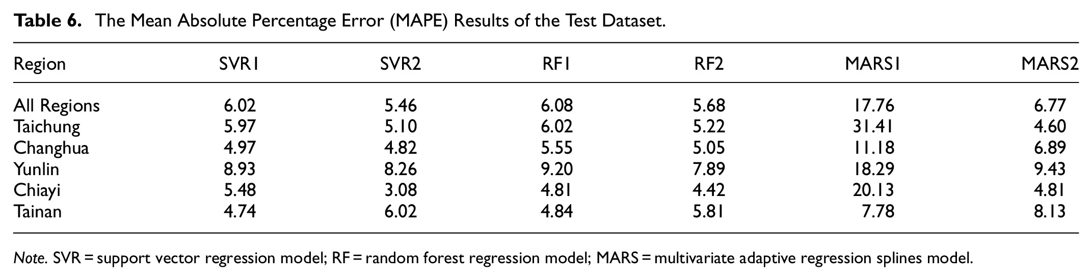 Table 6 shows the results of MAPE, and we use the results of Table 6 to compare the prediction performance with the test dataset. According to Table 6, the MAPE ranges from 4.74 to 31.41 for models with all climate variables; the MAPE ranges from 3.08 to 9.43 for models with the selected climate change variables. The prediction performance of models with the selected climate change variables is better than that of models with all climate variables, especially for the MARS model. According to the results, Yunlin needs to pay attention because the MAPE of any model is almost the highest in other regions.