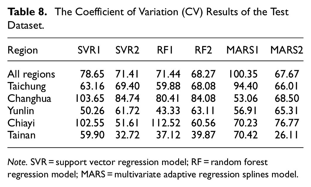 Table 8 shows the CV results, which measure the prediction stability of models. According to Table 8, the CV values range from 50.26 to 112.52 for models with all climate variables; the CV values range from 26.11 to 84.74 for models with the selected climate change variables. The performance of the SVR with the selected climate change variables model is almost the best because its average CV is almost the lowest or close to the lowest. Therefore, the SVR with the selected climate change variables model brings the most stable prediction performance.