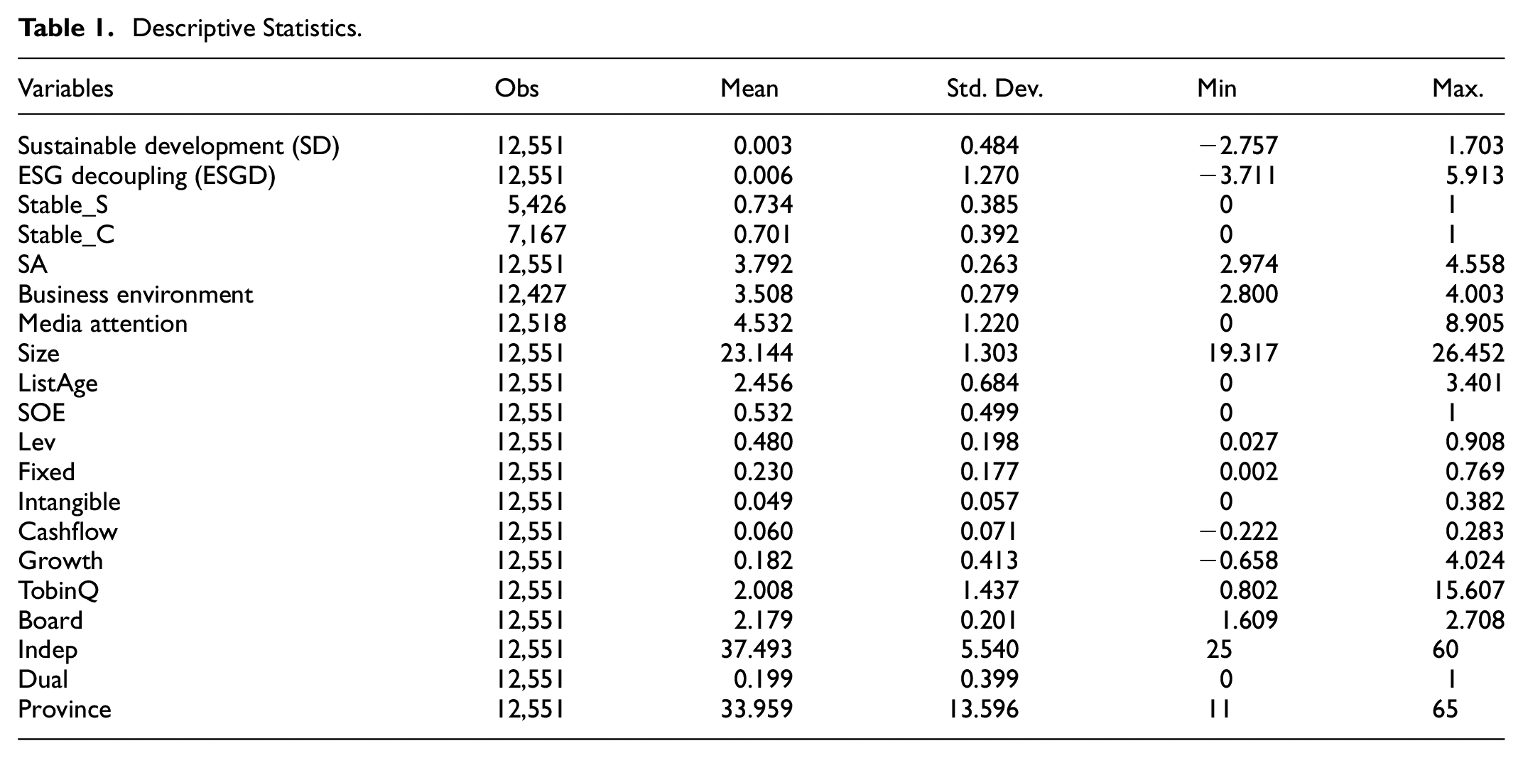 We employ the business environment as a metric to assess the formal institutional environment encountered by corporations, while the informal institutional environment is gaged through media attention. Specifically, we utilize the Business Environment Index from the China Provincial Business Environment Index Report, published by the Social Science Literature Press, 5 which ranges from 1 to 5 points. This index is matched with provinces and corporations to assess the business environment. Media attention is measured by taking the natural logarithm of the number of corporate news reports in the CNRDS after adding one to the count.