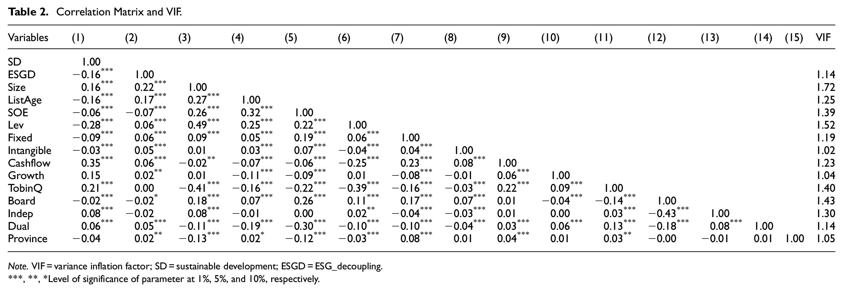 To check for severe multicollinearity in the model specification, we calculate the correlation coefficient and the variance inflation factor (VIF) before performing the following regression analyses. The results in Table 2 show that the correlation coefficients between the variables are all less than 0.5, and the values of the VIF are much less than 10. This indicates that our empirical study does not suffer from severe multicollinearity problems (Brooks, 2014; MacCallum & Browne, 1993).