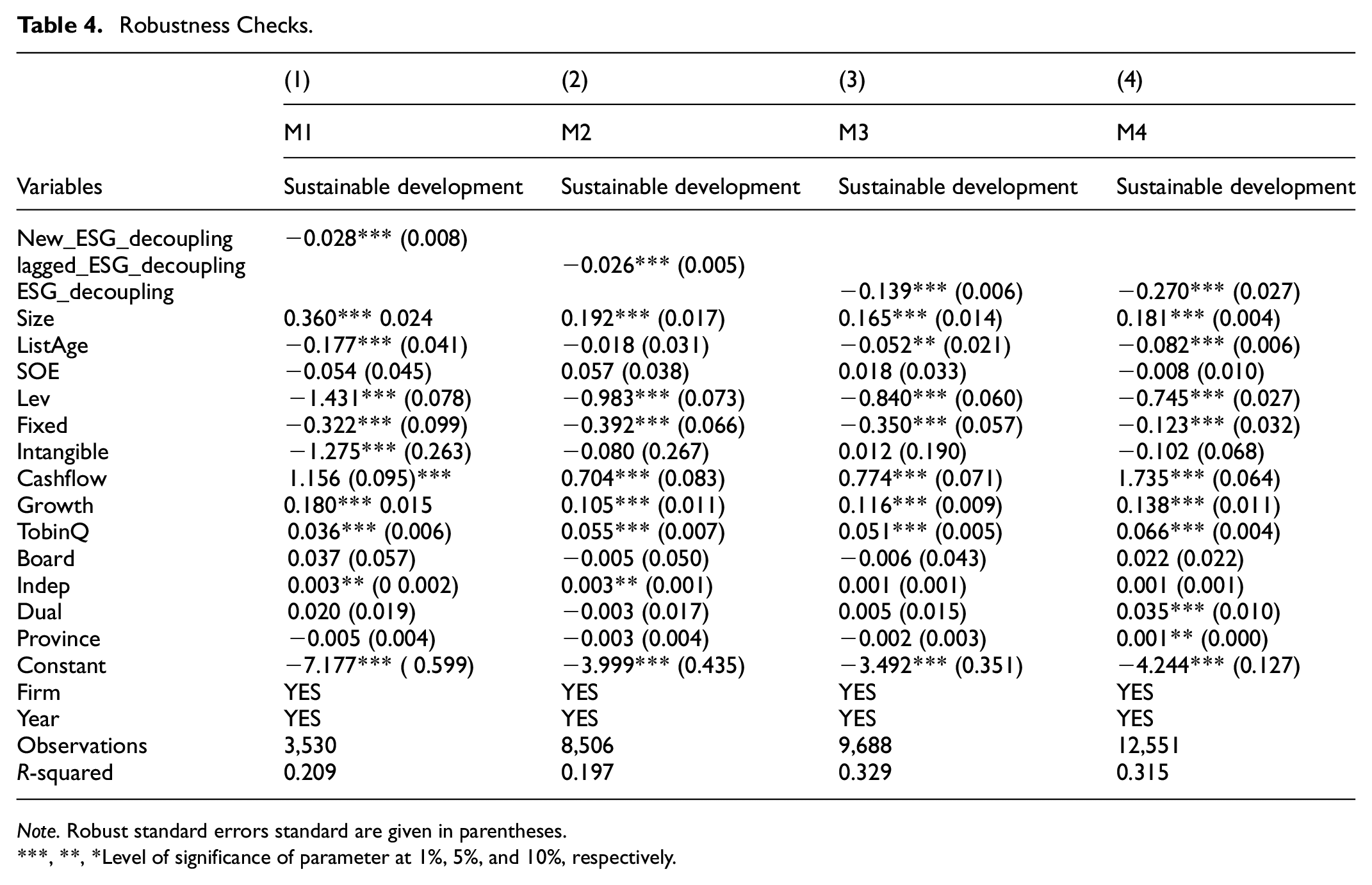 To strengthen the robustness of our results, we have adopted the method of substituting the ESG rating agency. Specifically, we have chosen the ESG performance data from SynTao Green Finance to measure the actual ESG performance. 6 SynTao Green Finance is a leading professional service institution in China for green finance and responsible investment. It launched its independently developed ESG rating system in 2015 and established the earliest ESG database for listed companies in China. This system is capable of accurately identifying the actual ESG performance of companies in the Chinese market. Based on this data, we further calculated the ESG decoupling. The results show that after substituting the measurement method of the variable, the impact of ESG decoupling on corporate sustainable development performance remains significantly negative (Table 4, column (1)), which confirms the robustness of our findings.