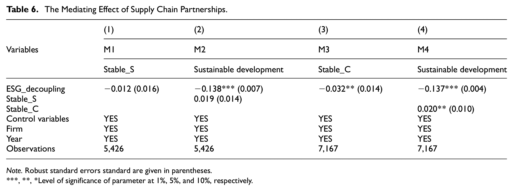 To verify the mediating role of supply chain partnership stability in the impact of ESG decoupling on corporate sustainable development performance, this paper refers to the three-step mediation effect procedure outlined by Wen et al. (2024) and constructs the following model:
