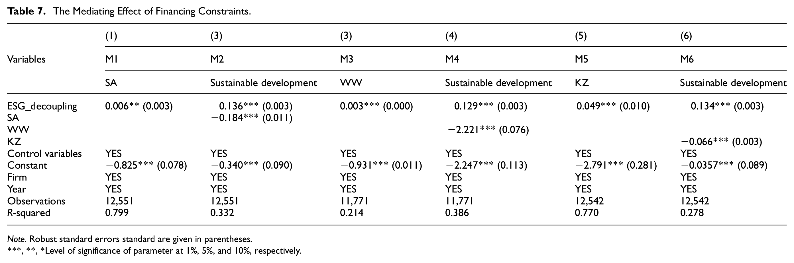 Table 7 shows the results of the mechanism of financing constraints. Column (1) reveals a significant positive relationship between ESG decoupling and the intensity of financing constraints at the 5% confidence level (β = .006,