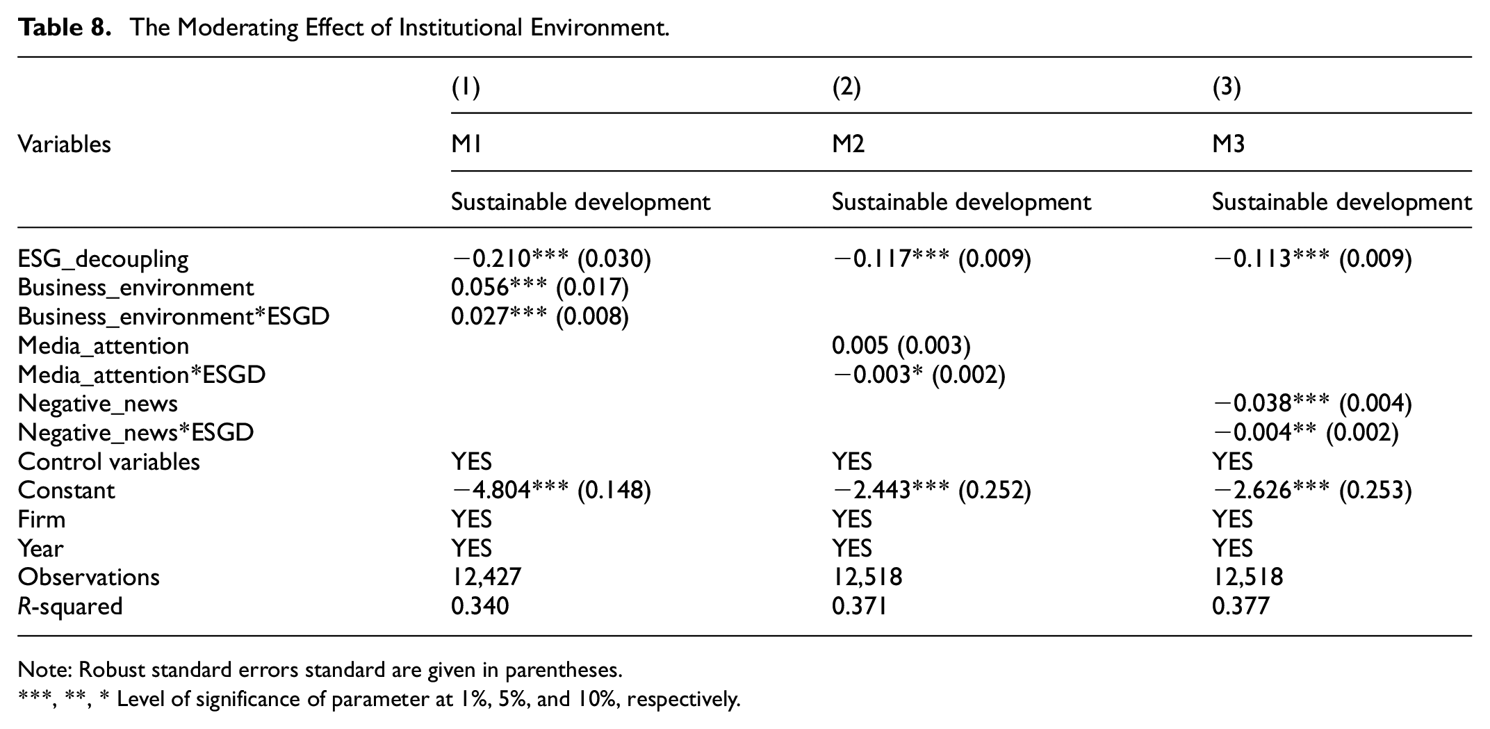 When companies encounter more rigorous informal institutional contexts, such as increased media attention and heightened public expectations, any adverse conduct will be amplified, resulting in greater reputational risk and a trust crisis. Once a firm exhibits such negative behaviors as ESG decoupling, it will be easily captured and quickly disseminated by the public and the media, thus triggering widespread attention and discussion (Davies & Olmedo-Cifuentes, 2016). The amplification of public opinion can further exacerbate the legitimacy gap between the firm and its external environment, exposing the firm to greater social pressure and skepticism. From the stakeholders’ perspective, which may lead to a drop in share price and increase the cost and difficulty of financing for the firm (Maung, 2024). Supply chain partners may also reevaluate the relationship for fear of reputational damage. Negative media coverage can further undermine consumer trust in a firm’s brand, leading to decreased sales and loss of market share (E. Spotts et al., 2014). It can even incur greater scrutiny and regulation from regulators, increasing compliance costs and operational pressure on corporations (W. Li et al., 2023). Therefore, a stricter informal institutional environment represents a higher intensity of social supervision and pressure, which will exacerbate the negative impact of ESG decoupling on sustainable development.