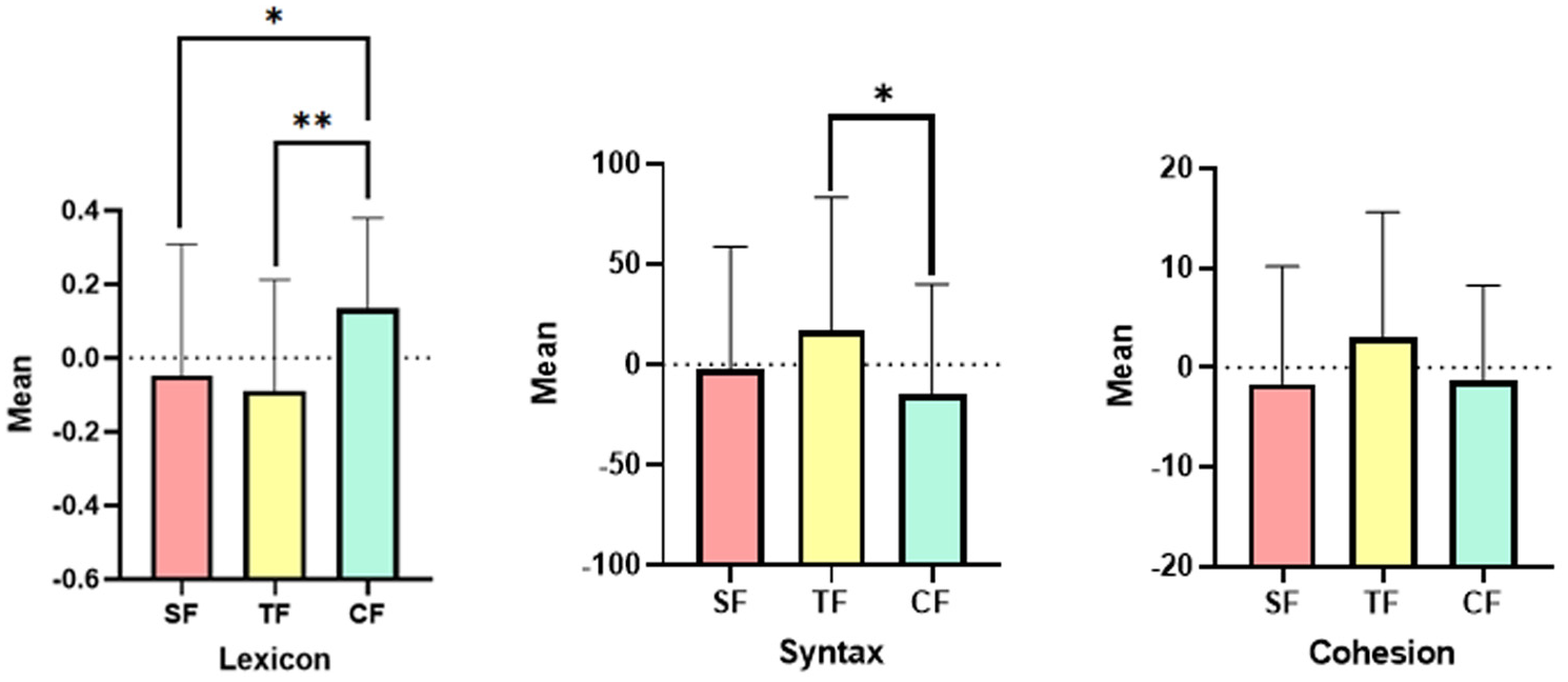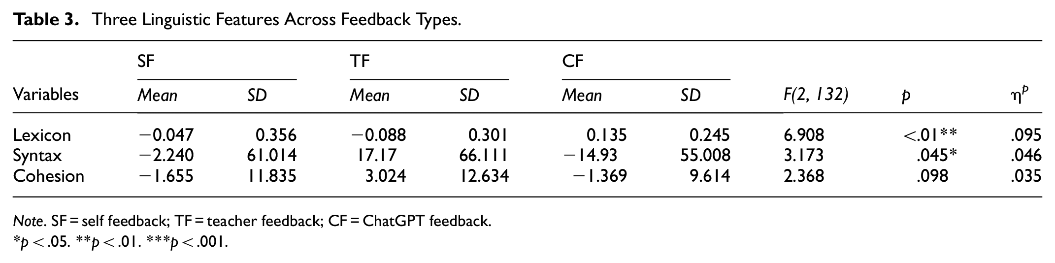 Table 3 shows the result of the first one-way ANOVA. The independent variable was “Type” (SF, TF, and ChatGPT feedback) and the dependent variables were the three latent linguistic features (Lexicon, syntax, and cohesion). The results showed a significant main effect of “Type” on the lexicon (