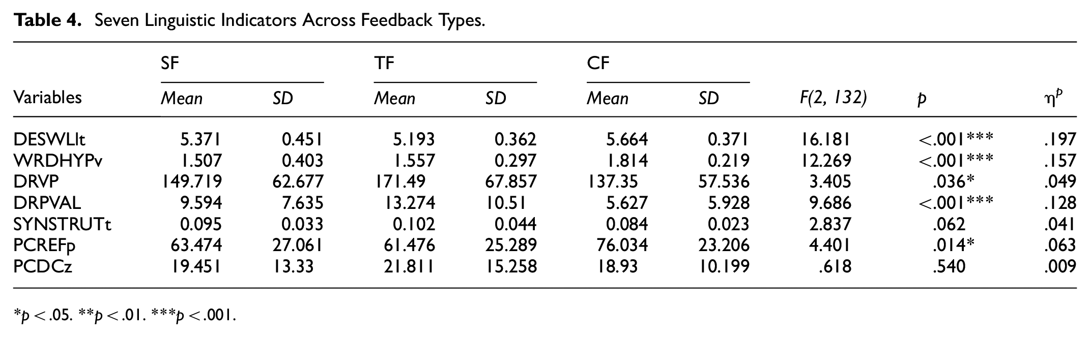 A second round of ANOVA tests the effect of “Type” (SF, TF, and ChatGPT feedback) on seven specific observable linguistic indicators (Please see Table 4). It found that five out of the seven indicators were significantly affected by “Type”: DESWLlt/word length (