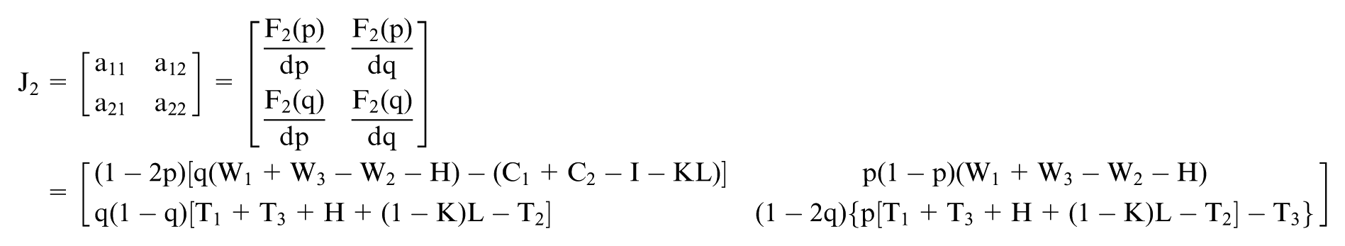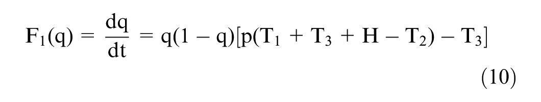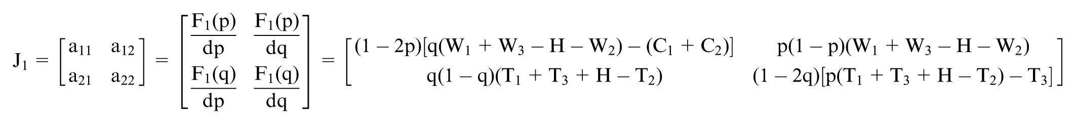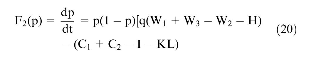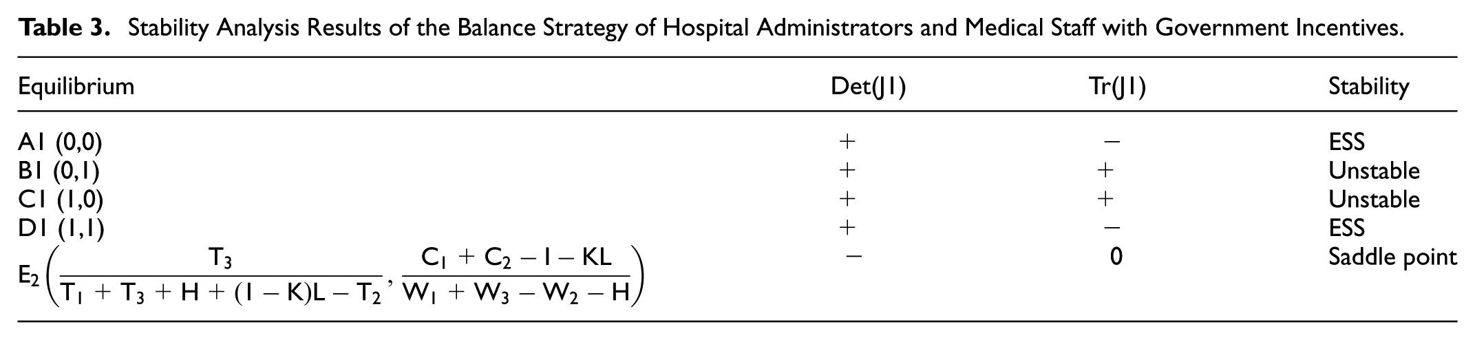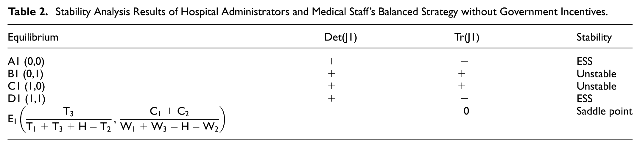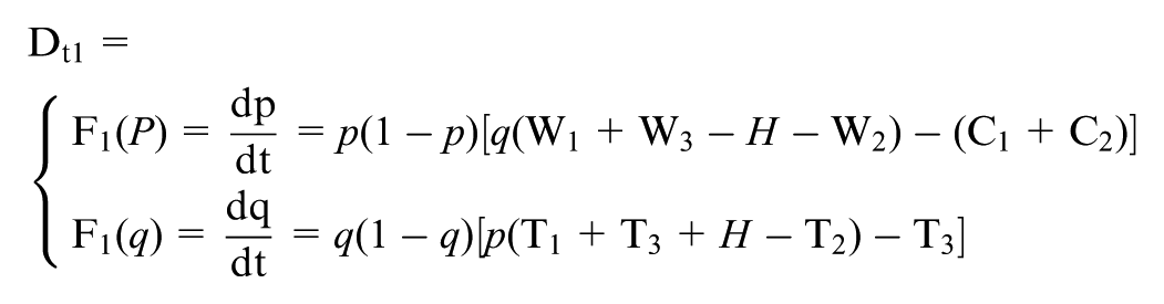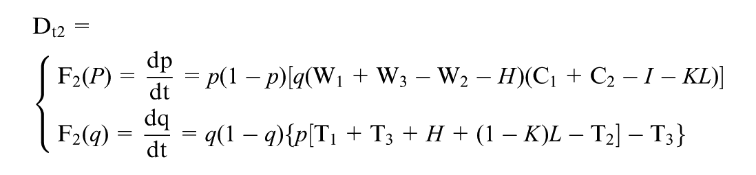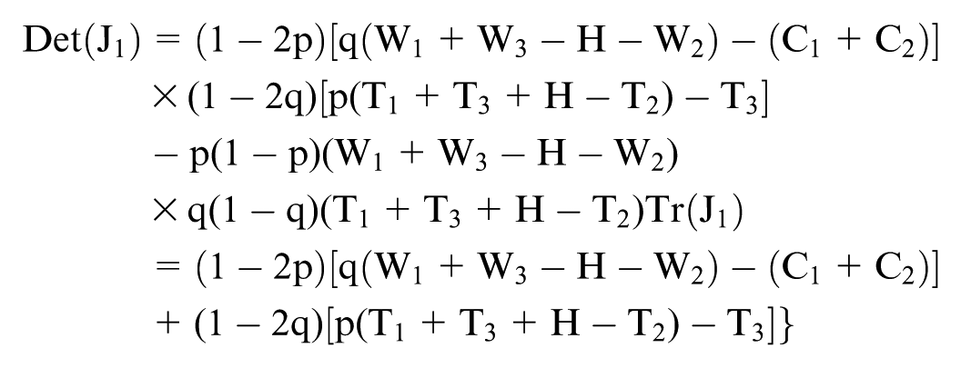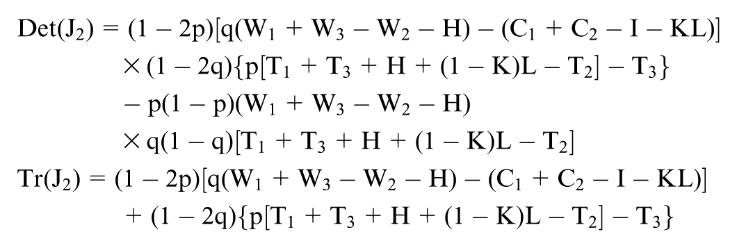 However, not all equilibrium points are stable equilibrium strategies of the game system. According to Friedman (1991), stability can be determined by evaluating the determinant of the Jacobian matrix Det(J1) and the trace Tr(J1).