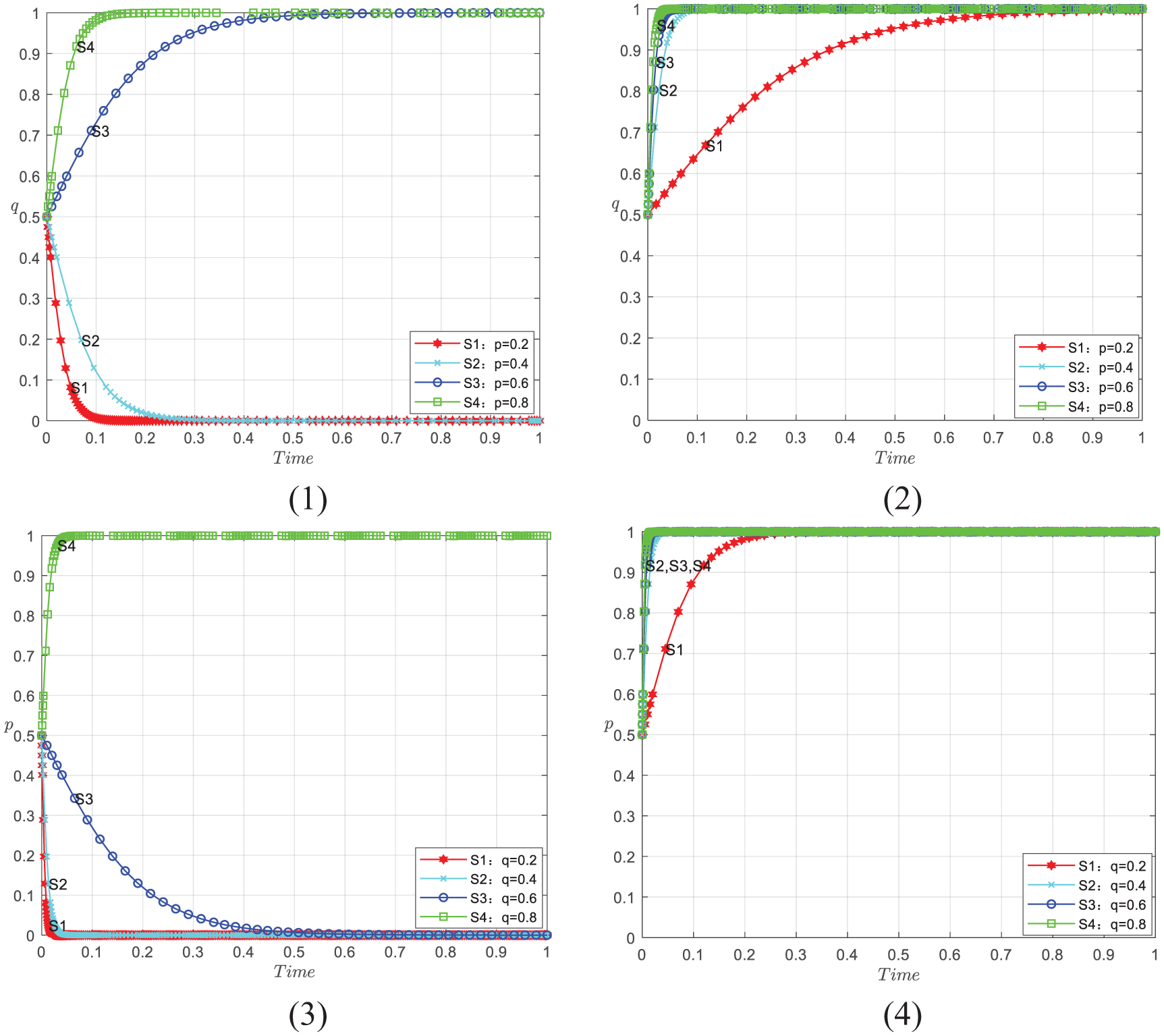 In Figure 4(1), when there are no government incentives, the saddle point’s position is approximately at E1 (0.42, 0.62) after parameter adjustments. At this point, the initial positions located within the lower-left quadrant of the saddle point gradually converge toward the outcome A1 (0, 0), signifying (not build, not actively use). Conversely, initial positions within the upper-right quadrant of the saddle point eventually tend toward the result D1 (1, 1), indicating (build, actively use).