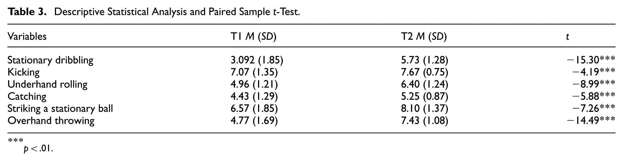 Consistent with prior validation protocols (Li & Ma, 2007), the structural validity of TGMD-2 was established through item-total correlation analysis. As presented in Table 1, all subtests demonstrated statistically significant correlations with the total score (