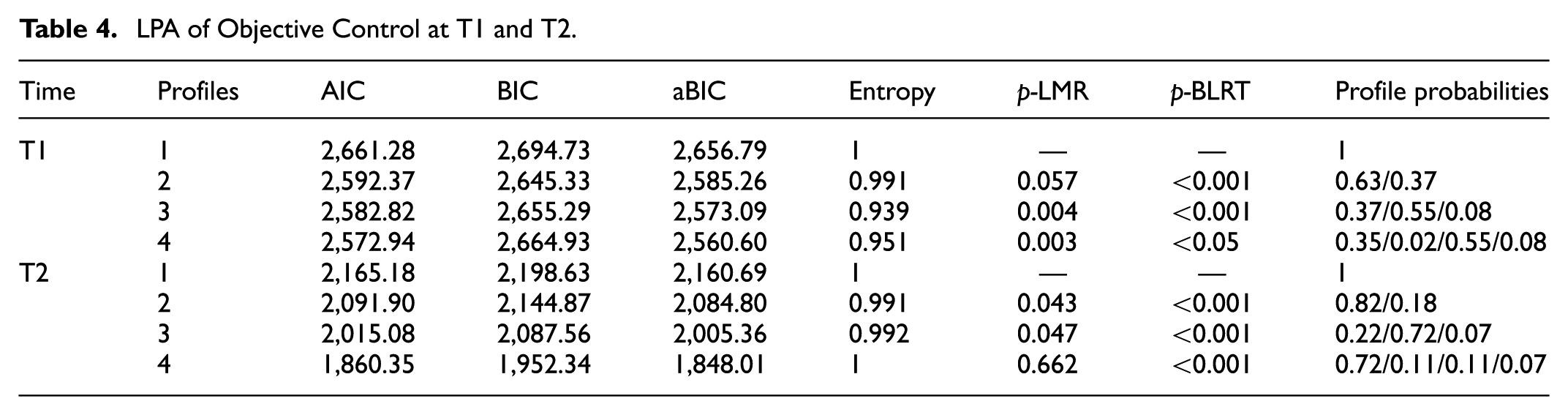 LPA of Objective Control at T1 and T2.