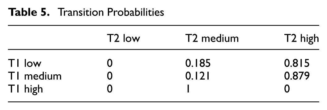At T1, with the Low profile serving as the reference category, no significant gender differences were observed across the profiles (OR = 1.45; OR = 2.41). However, at T2, when the Low profile remained the reference category, the findings indicate that boys were more likely than girls to transition into the Medium profile (OR = 3.96).