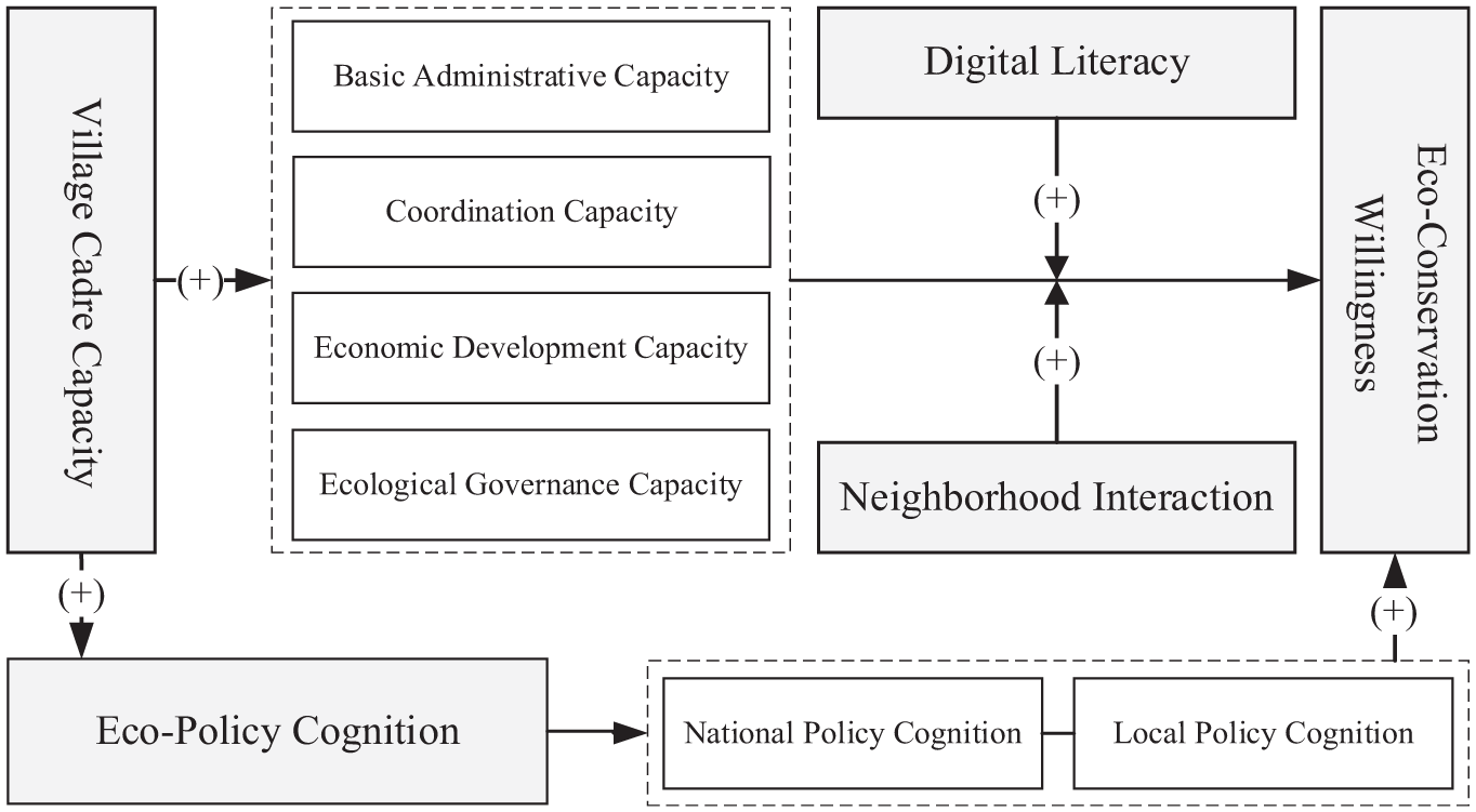 The Theory of Planned Behavior (TPB) suggests that individual actions stem from planning (Ajzen, 1988). Typically, individuals first develop psychological factors such as thoughts and perceptions, which generate willingness and ultimately lead to corresponding behaviors (Adnan et al., 2018; Bamberg & Möser, 2007; P. Liu et al., 2020). Thus, cognition underpins the development of willingness, and rural residents’ willingness to engage in eco-conservation is shaped by their cognition of eco-policies (H. Shi et al., 2017; Song et al., 2024). However, when information is incomplete, decision-makers depend on information from others to inform their judgments and correct cognitive biases (Ouyang et al., 2025). As promoters and enforcers of national policies, village cadres play a crucial role in correcting rural residents’ biased perceptions of eco-policies: their capacity influences how accurately and effectively policy information is shared, which significantly impacts residents’ understanding and valuation of eco-policies, thereby motivating their internal drive to participate in eco-conservation. Based on this, we propose the following research hypothesis: