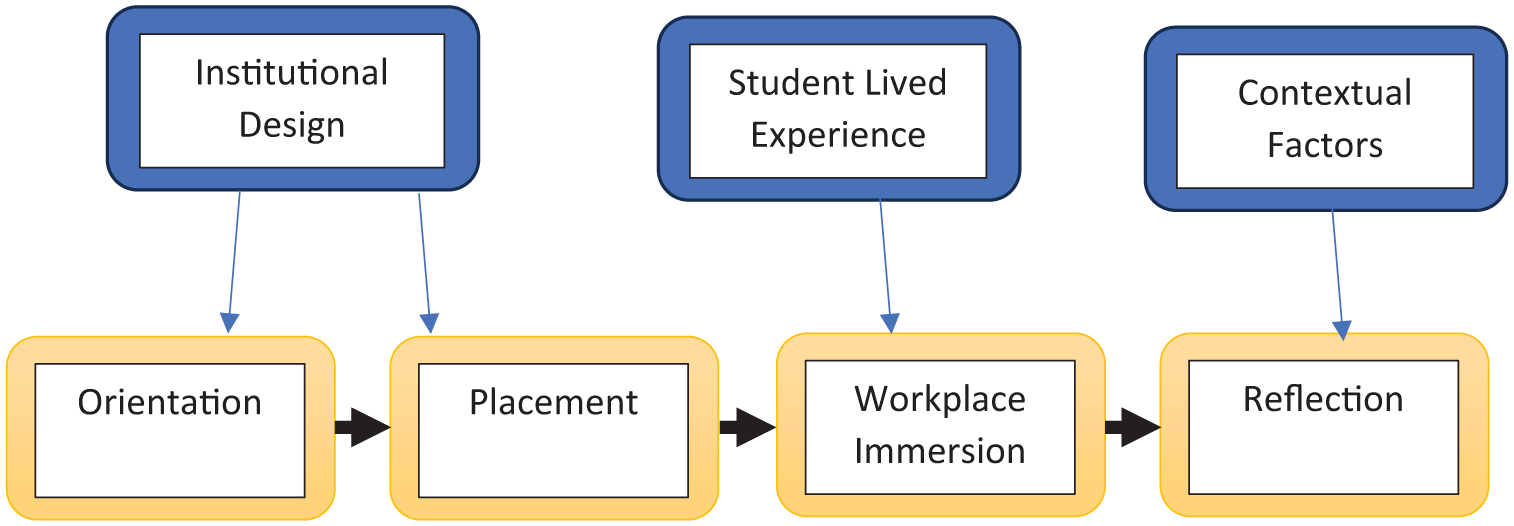 The conceptual framework that informs this study is constructed around the interplay of three core components: institutional design, student experience, and contextual enabling factors. These elements collectively shape how workplace experience learning is implemented and experienced within pre-tertiary TVET settings in Ghana. First, the