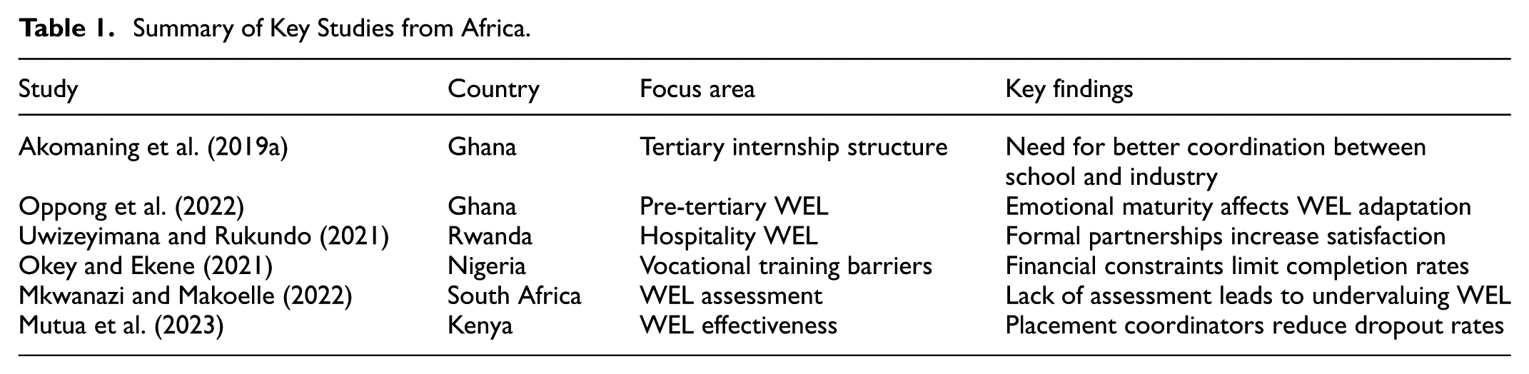 While African studies offer valuable insights into WEL implementation, there remains a lack of focus on pre-tertiary learners. Much of the existing literature addresses tertiary-level learners, with limited exploration of the distinct developmental and logistical challenges faced by adolescents in pre-tertiary TVET settings. This represents a significant oversight, given the growing policy attention toward WEL at this level.