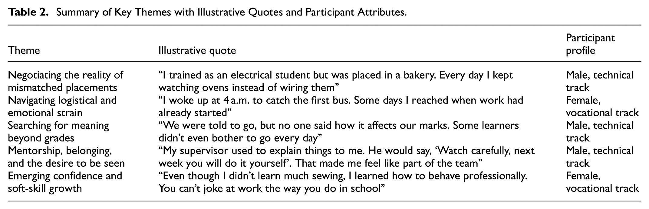 In the reporting of qualitative findings, all participant names have been replaced with pseudonyms to ensure confidentiality and protect the identities of the individuals involved. The findings from the in-depth interviews with 22 pre-tertiary TVET learners are presented under five interrelated themes that emerged through phenomenological analysis. These themes capture the essence of how learners lived, interpreted, and made sense of their participation in the Workplace Experience Learning (WEL) program. Each theme combines descriptive and interpretive accounts to reveal both the diversity and the shared meaning structures that characterized learners’ experiences. Table 2 provides an overview of the key themes and illustrative participant quotes.