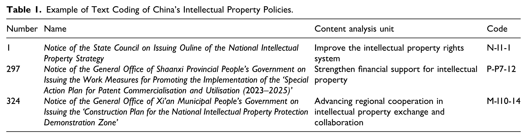 According to the above search categories, the 329 IP policy texts were categorised and subdivided into groups of national, provincial, and municipal policy texts. They were then numbered within each group and coded. The specific articles or chapter titles of the texts were used as the unit of analysis in the form of ‘Policy No.-Article/Chapter Serial No.’ (Table 1). For example, the national policy text in the IP category entitled ‘
