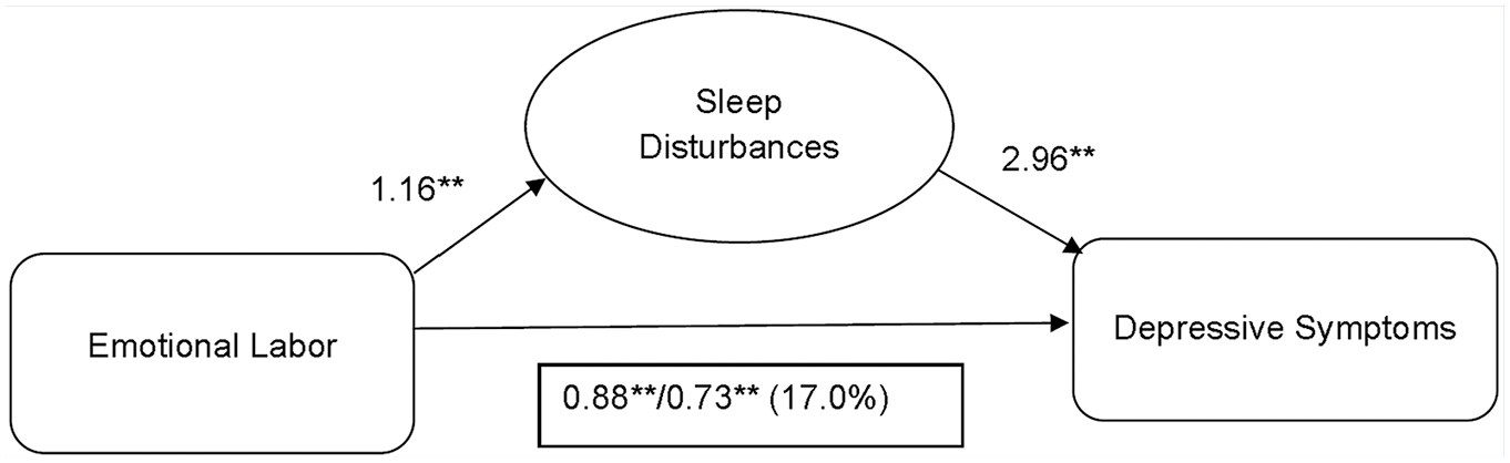 In the multivariable Poisson and linear regression models, there were significant associations between emotional labor and sleep disturbances (Table 3, Model 2a), and between sleep disturbances and depressive symptoms (Model 3a), after adjustment for covariates (Table 3). After introducing sleep disturbances into the model (Model 4a), emotional labor remained a significant association with depressive symptoms. Sleep disturbances were associated with depressive symptoms and partially attenuated this association by 17.0%. The mediating role of sleep disturbances between emotional labor and depressive symptoms is shown in Figure 1.