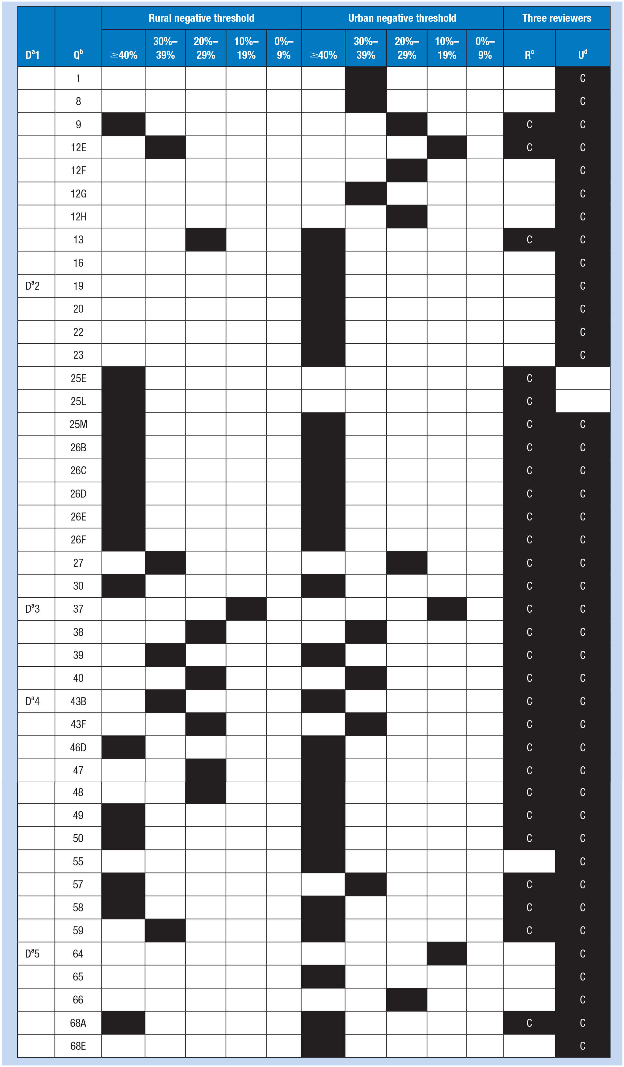 In this study, we implemented a three-part methodology for data analysis aimed at identifying concerning well-being items among clinicians in rural and urban hospitals. This approach involved establishing marked thresholds, independent review and resolution of discrepancies by research team members, and validation through focus groups. The results showed that urban hospitals had more concerning thresholds across each domain compared to rural hospitals, with 41 concerning thresholds in urban hospitals versus 28 in rural hospitals, totaling 68 items.