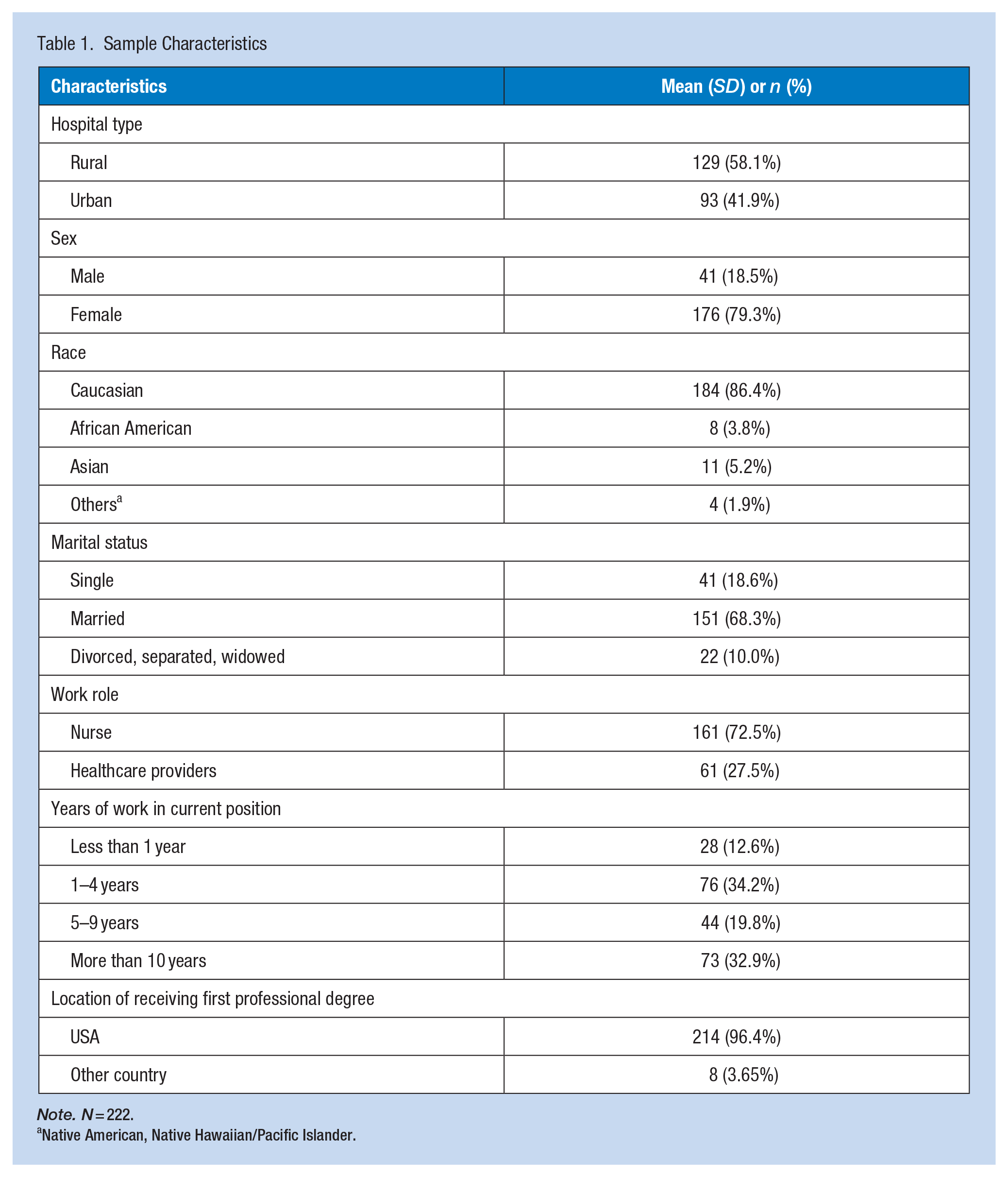 Our study had a response rate of about 22% (222 clinicians) across hospitals with 129 from the three rural hospitals, and 93 from the urban hospital. The distribution of nurses and healthcare providers was 161 and 61, respectively. Regarding their tenure in their current positions, a significant proportion had been working for 1 to 4 years (34.2%) or more than 10 years (32.9%). The demographic information of the sample is presented in Table 1, showing that the majority of participants were female (79.3%) and Caucasian (86.4%), with over two-thirds being married (68.3%).