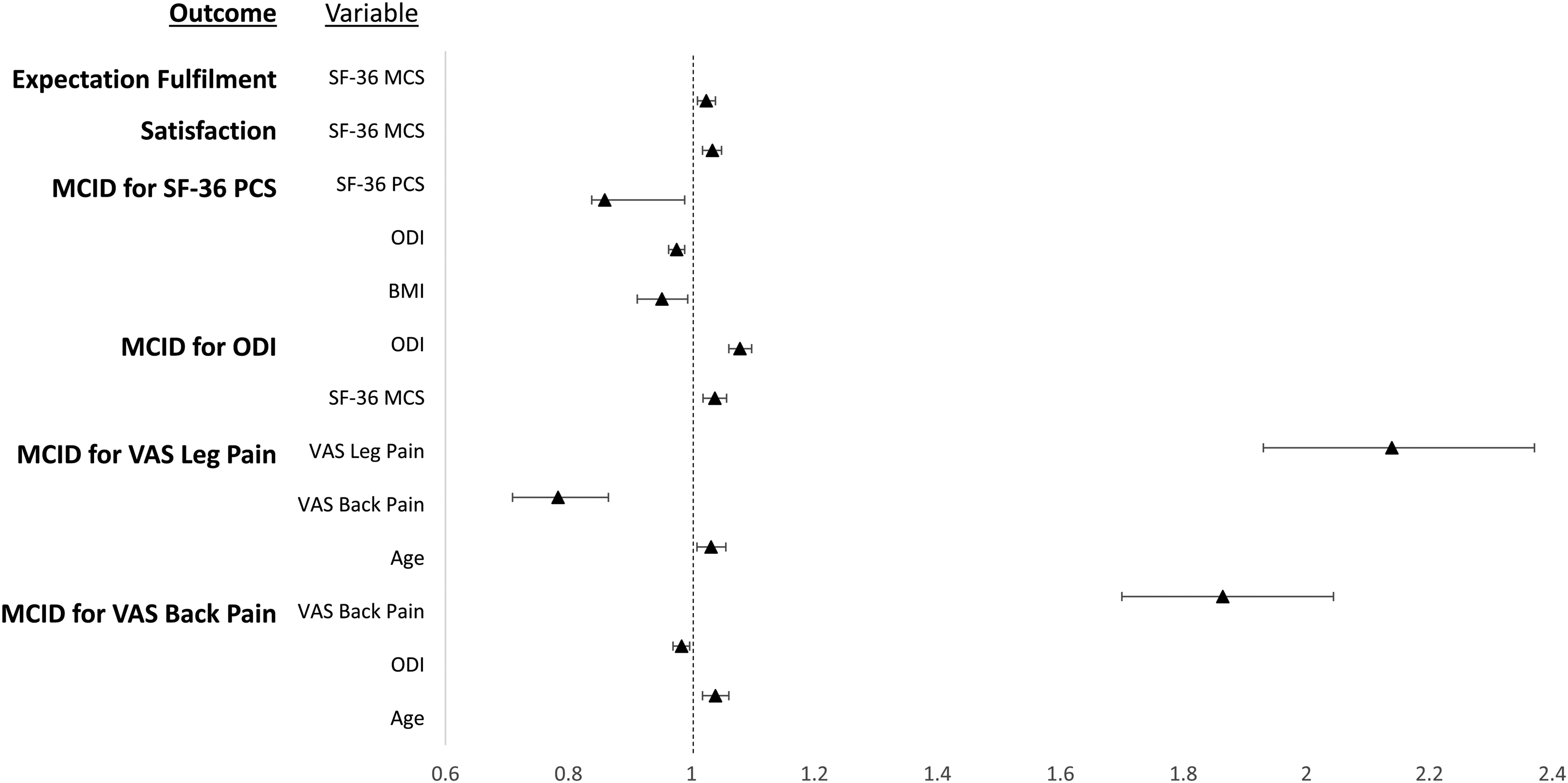 Abbreviations: OR, odds ratio; CI, confidence interval; BMI, body mass index; MCID, minimal clinically important difference; VAS, visual analogue scale; ODI, oswestry disability index; SF-36 PCS, short form-36 physical component score; SF-36 MCS, short form-36 mental component score.
