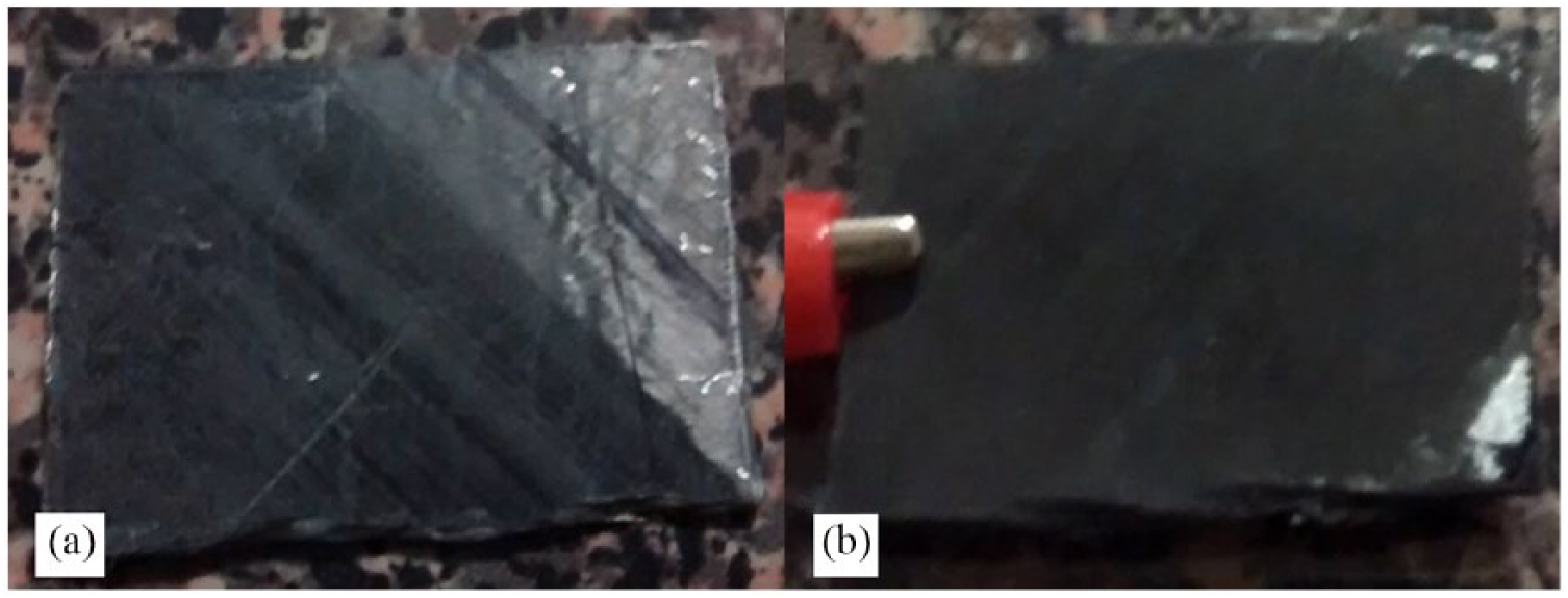 (a) Electrode with composite material 4 cm × 2 cm. (b) Worn electrode with sandpaper of 200 grains/cm2.