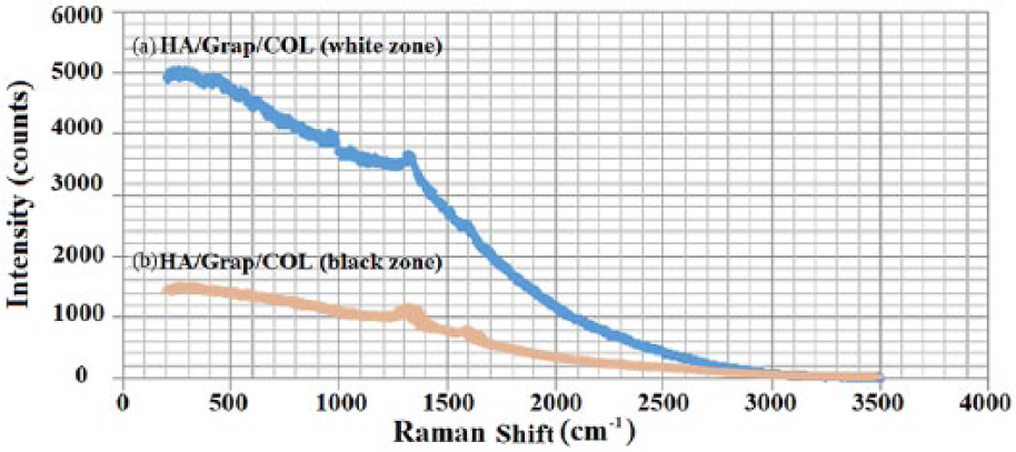 (a) Raman spectroscopy of hydroxyapatite/graphene/collagen (HA/Grap/Col) formulation on the white zone. (b) Raman spectroscopy of HA/Grap/COL formulation on the black zone.