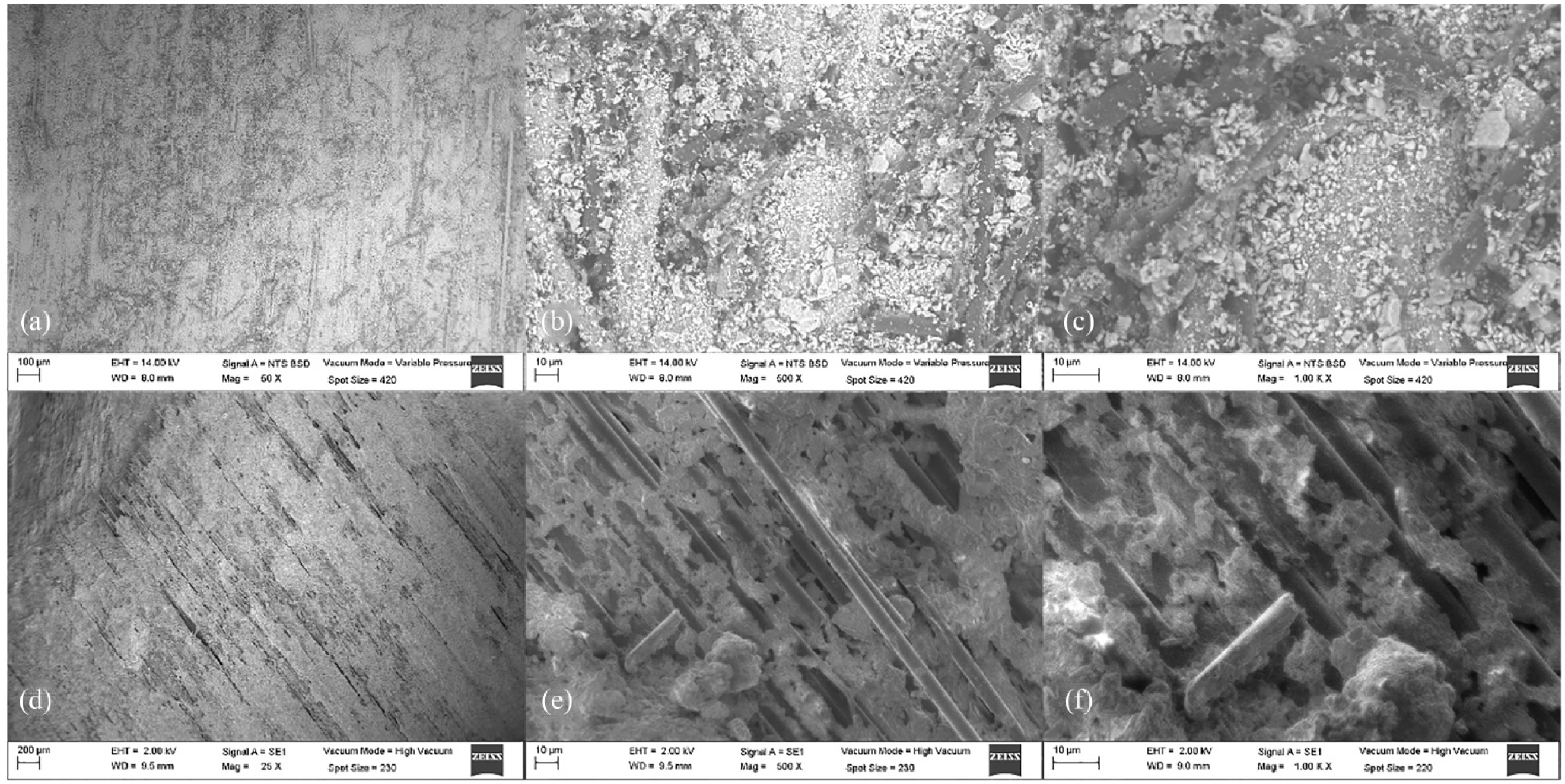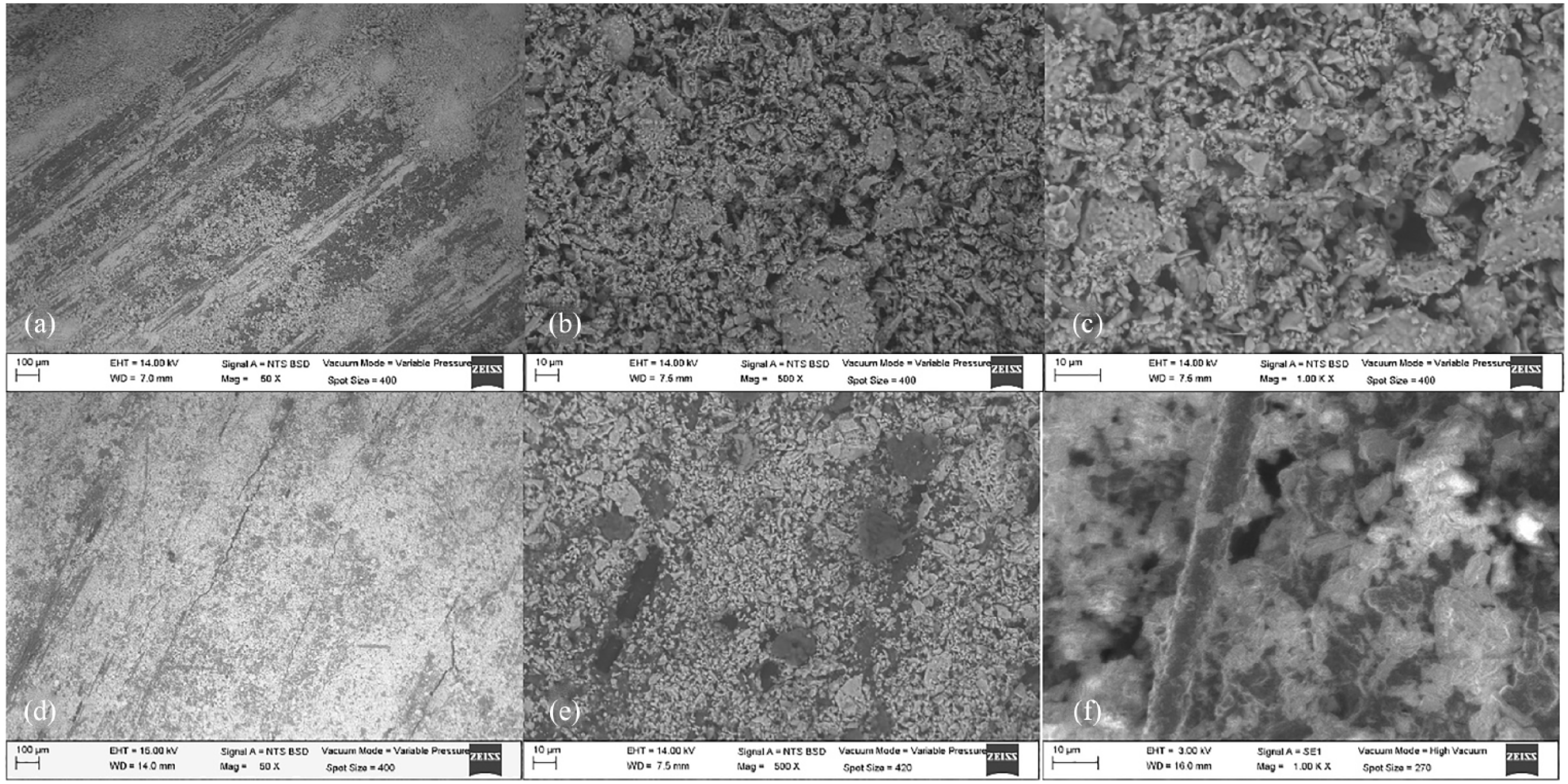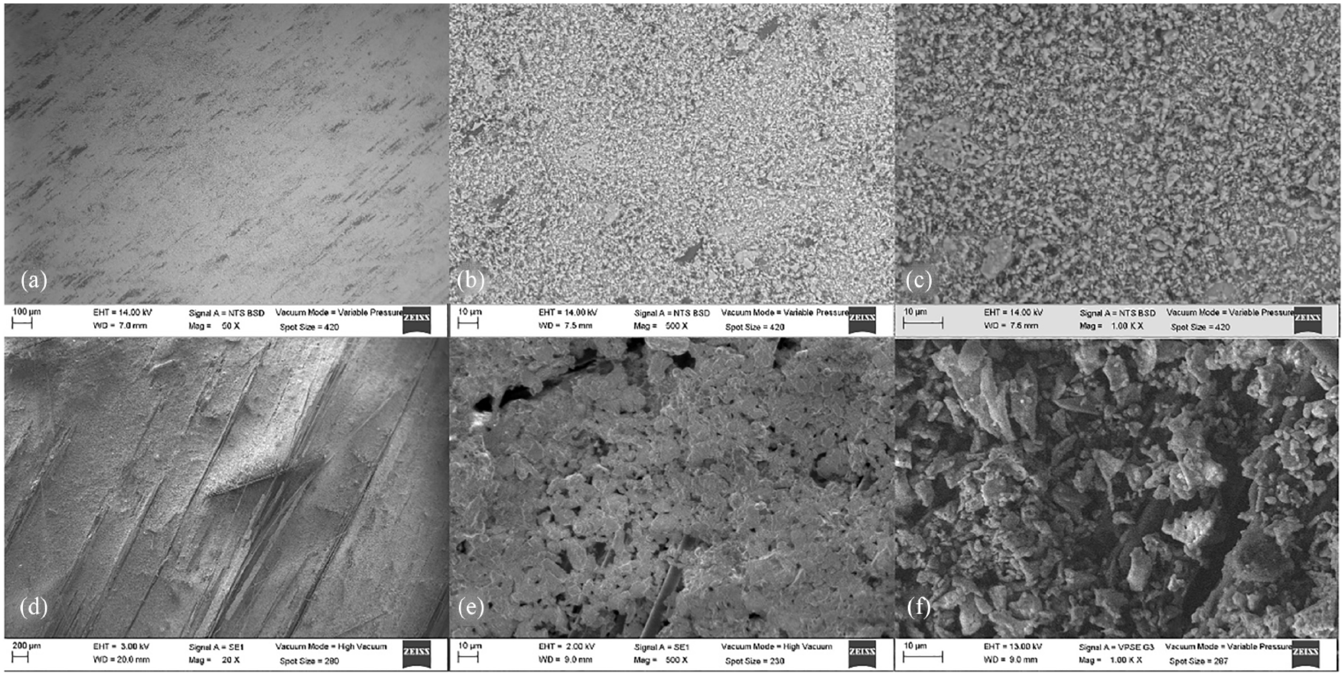 Microscopy of hydroxyapatite (HA) and 10% w/w/w HA/graphene/collagen (HA/Grap/Col) coatings on the carbon fiber surface: (a) HA coating at 50× magnification; (b) HA coating at 500× magnification; (c) HA coating at 1000× magnification; (d) HA/Grap/Col coating at 50× magnification; (e) HA/Grap/Col coating at 500× magnification; (f) HA/Grap/Col coating at 1000× magnification.