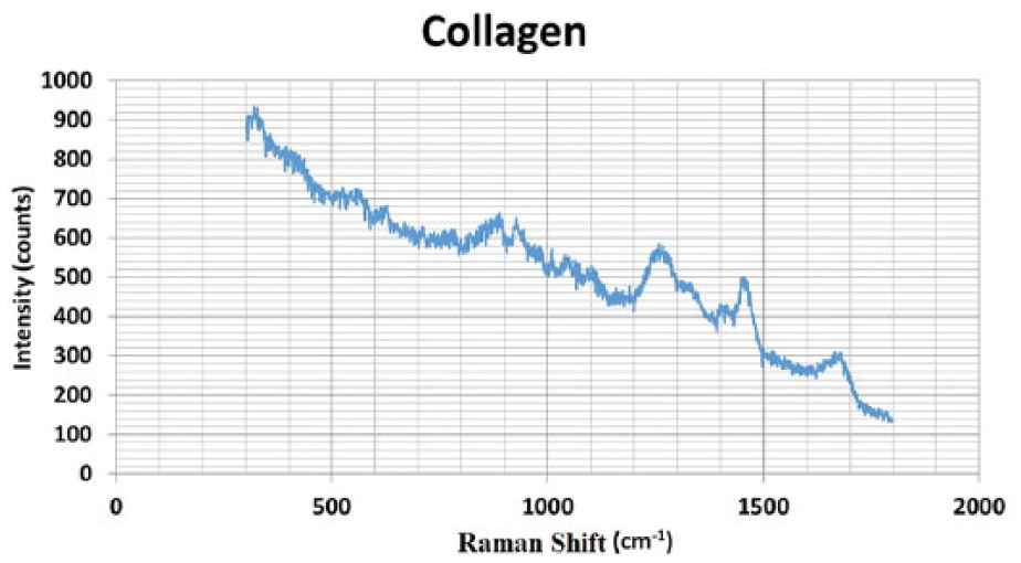 Blanks of the materials that confirmed the blends were made: HA, collagen, graphene nanofibers, and the surface of the pre-treated electrode. The Raman spectrum of the target of HA is shown in Figure 2. Figure 8 shows the Raman spectrum of collagen, where the band at 1658 cm−1 corresponds to amide I C=O stretching vibration, and peaks between 1234 and 1243 cm−1 are assigned to amide III, mainly C-N stretching and N-H in-plane bending vibrations, which correspond to proline-poor or polar regions of collagen. The bands at 1408 cm and 1451 cm−1 are assigned to (CH3, CH2) bending vibrations due to the amino acid side chain of collagen.35–37