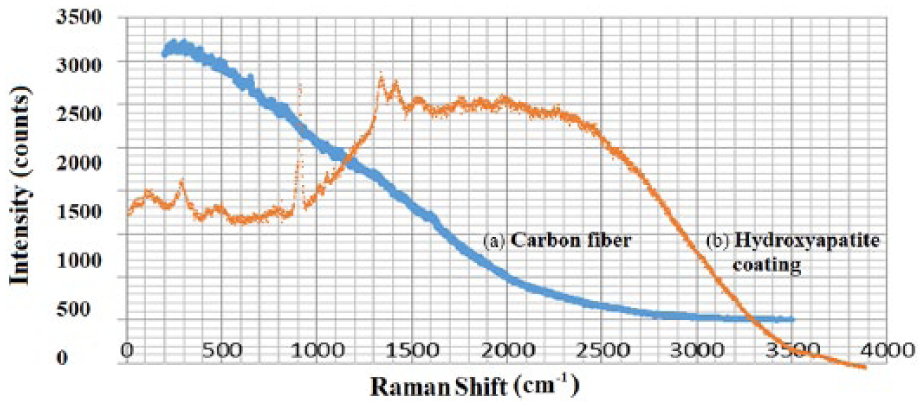 Most of the sample has two zones: a white zone created by HA on the surface and a black zone in which most of the deposit was graphene. Figure 10(a) shows the spectrum of the white zone of the carbon fiber coated by the mixture of HA, graphene, and collagen, which reveals the presence of HA, while Figure 10(b) shows the spectrum of the black zone where no HA is present. Collagen peaks were not detected in the Raman spectrum.