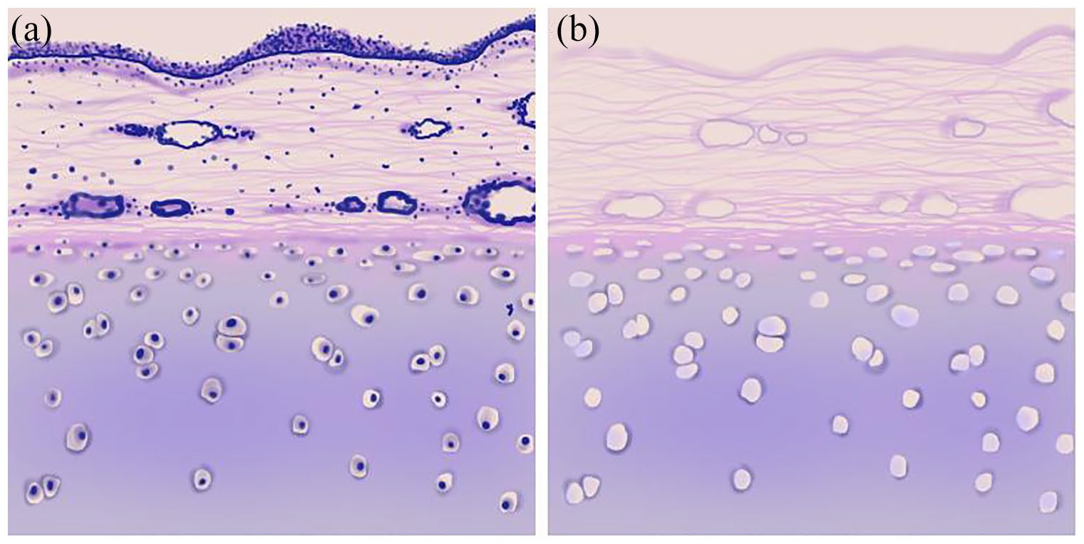 The commonly used methods for decellularization include physical (such as freeze-thaw and lyophilization), chemical (such as sodium dodecyl sulfate (SDS) and Triton x-100), and enzymatic (such as DNase) methods.41–43 Repeated decellularization cycles may remove the immunogenic components of the donor tissue as much as possible. However, excessive durations of these inevitably cause the loss of GAGs in the ECM, potentially weakening the biomechanical integrity of DTS. 31 To maintain a balance between the removal of cellular components and preservation of cartilage ECM, the duration and method of decellularization are essential. Here, we list some recently developed representative DTS methods (Table 1).
