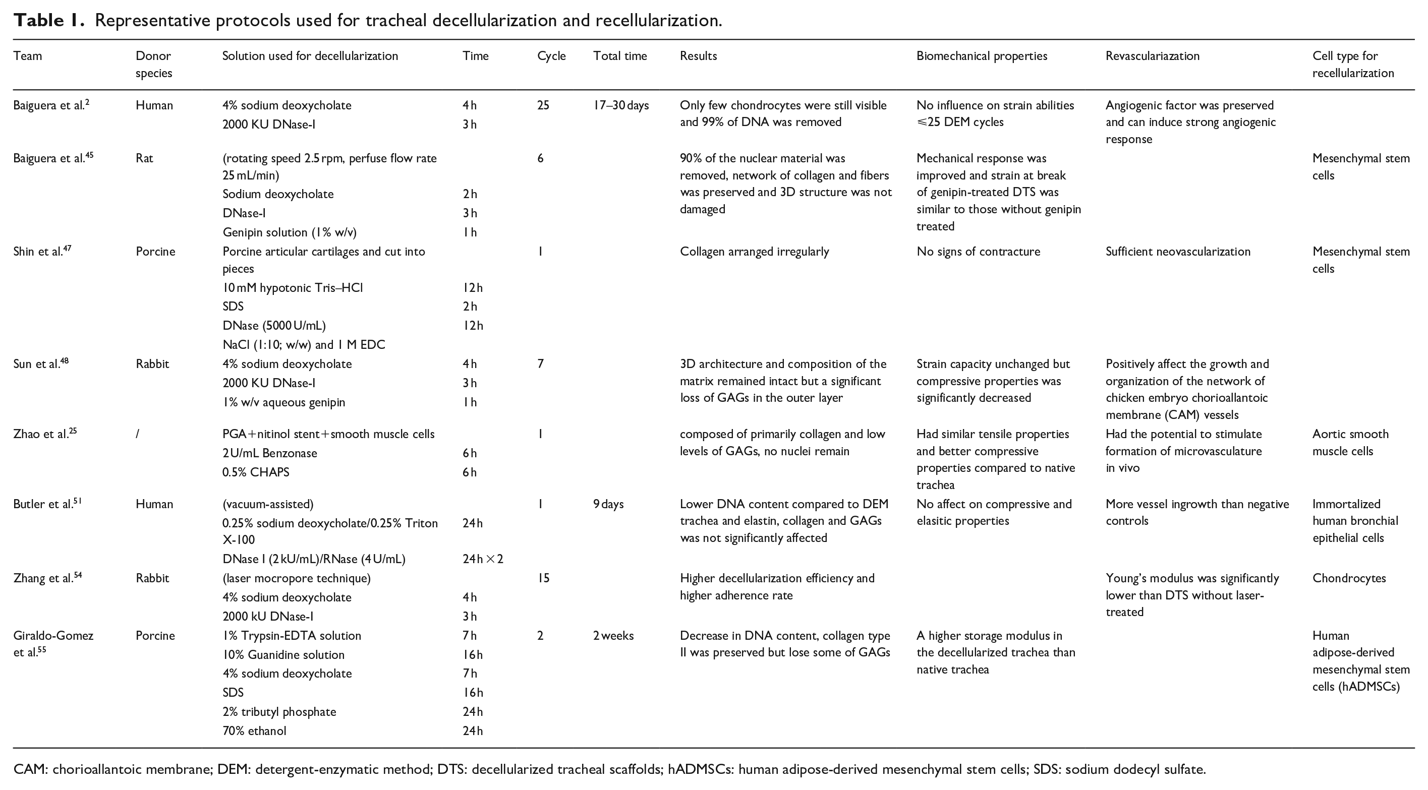 In 2017, Butler et al. 51 applied a new technique that shortened the entire process to 9 days. The trachea was lyophilized prior to decellularization. The tissue was treated with 0.25% sodium deoxycholate/0.25% Triton X-100, followed by DNase-I (2 kU/mL)/RNase (4 U/mL) to remove cellular and DNA components. In contrast to previous methods, the entire process was performed in an autoclaved chamber generating a vacuum environment (1 Torr). Compared to the DEM, vacuum-assisted-decellularized trachea had a lower DNA content and similar ECM components (elastin, collagen, and GAGs), cytocompatibility, and biomechanical properties. Furthermore, using a vacuum may accelerate the process and minimize the loss of structural components caused by long-term storage.49,52