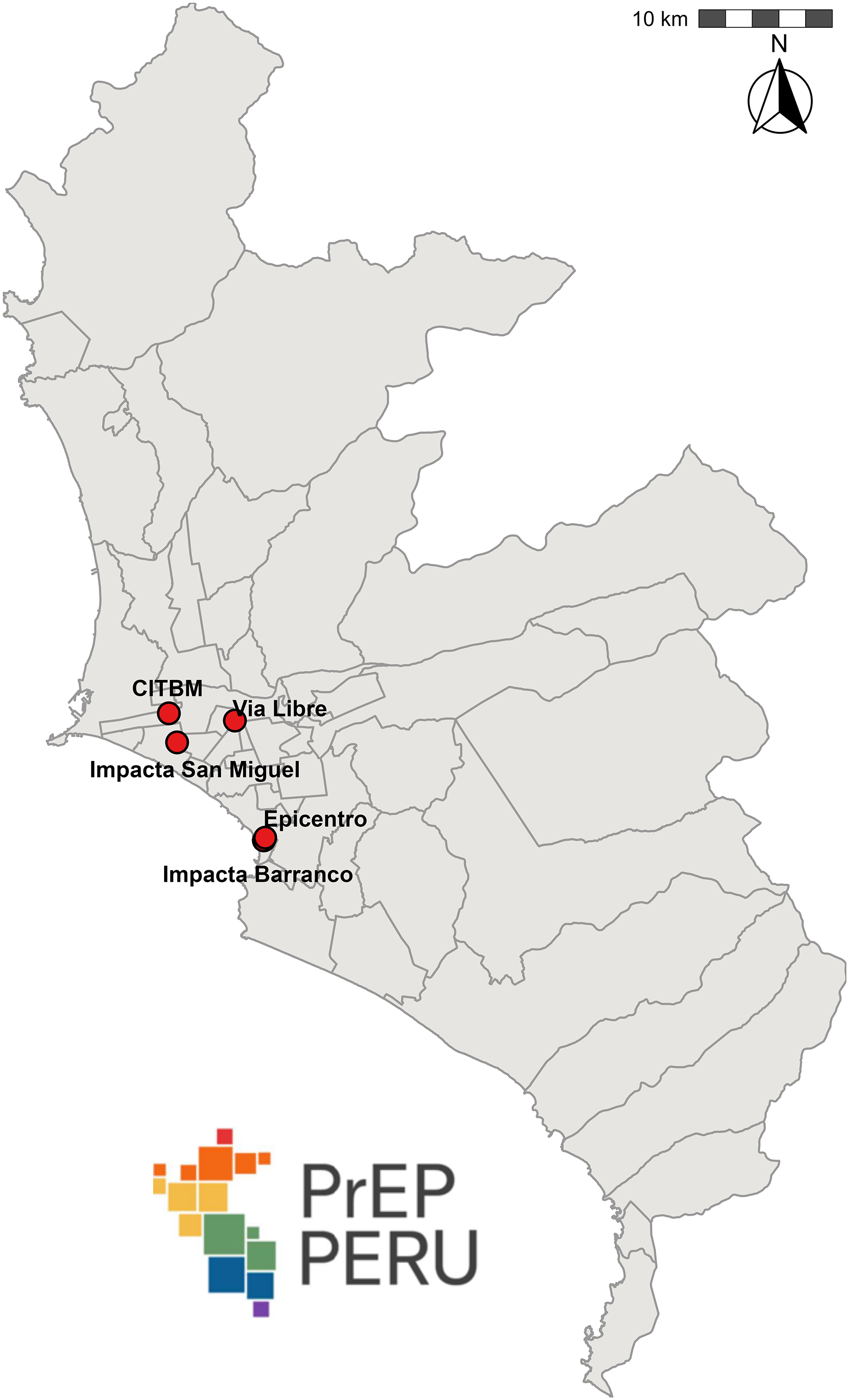 PrEP PERU is a longitudinal, prospective, multicenter demonstration project evaluating daily oral HIV PrEP implementation at ASOs in Peru. The study was implemented at 4 ASOs in Lima, Peru, selected for their established clinical infrastructure, experience with HIV prevention research, strong ties to MSM and TGW communities, and complementary distribution across Metropolitan Lima