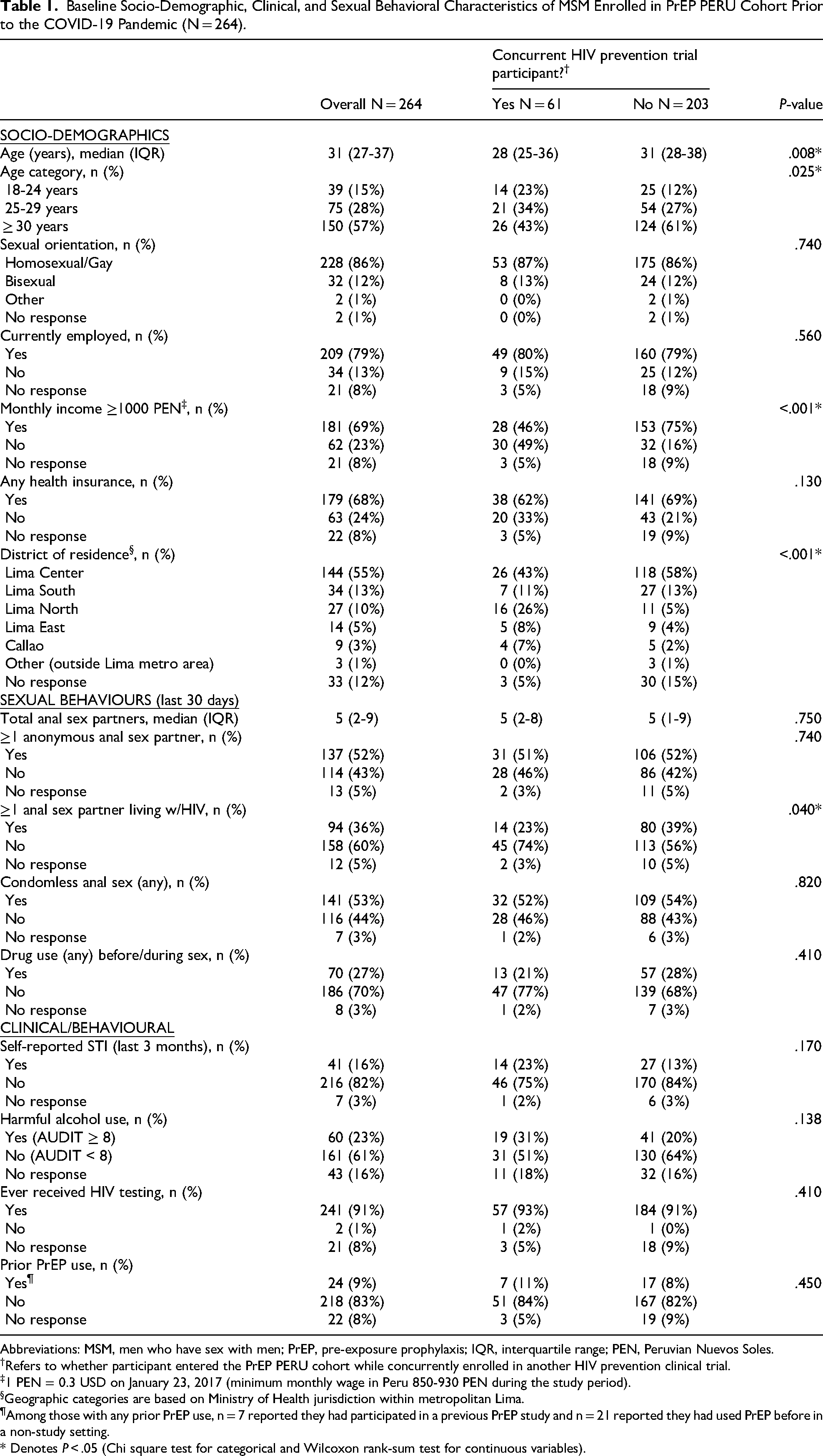 Baseline Socio-Demographic, Clinical, and Sexual Behavioral Characteristics of MSM Enrolled in PrEP PERU Cohort Prior to the COVID-19 Pandemic (N = 264).