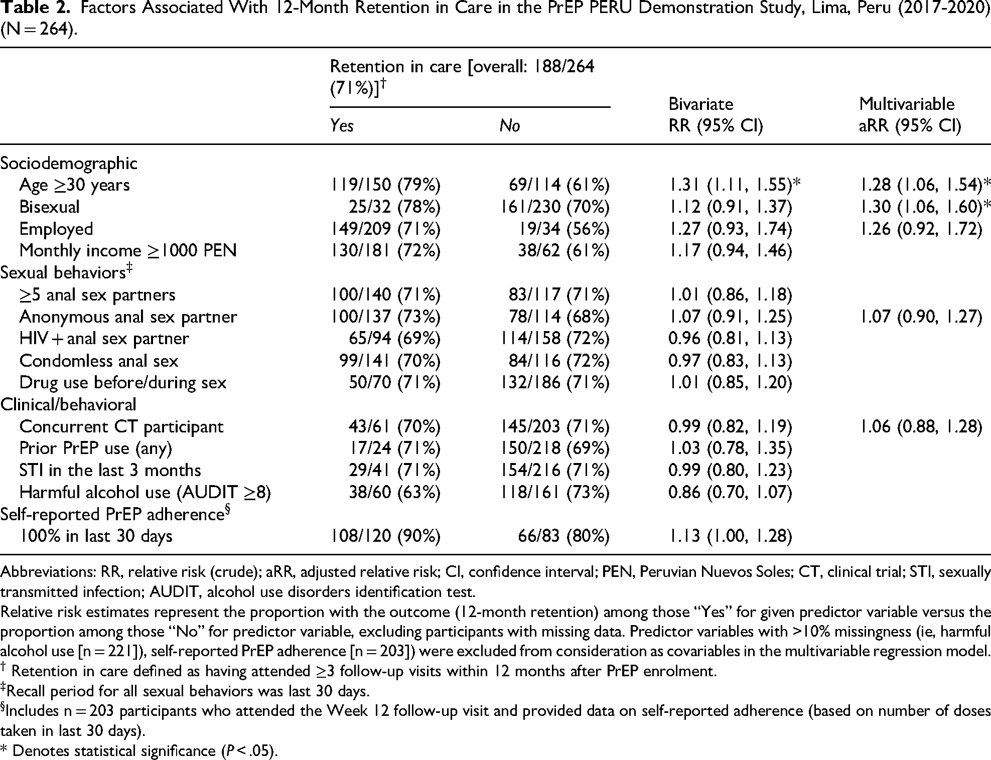 Factors Associated With 12-Month Retention in Care in the PrEP PERU Demonstration Study, Lima, Peru (2017-2020) (N = 264).