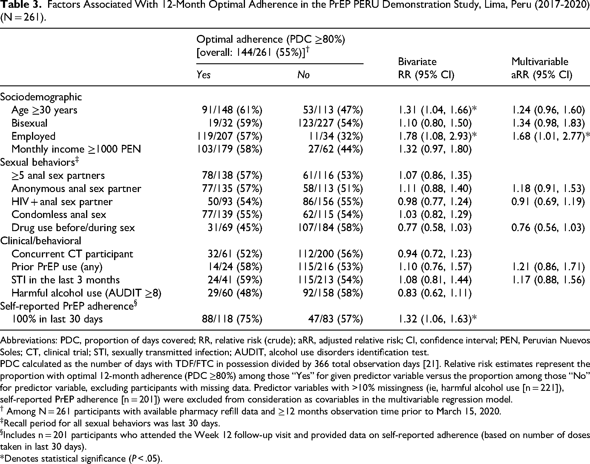 Factors Associated With 12-Month Optimal Adherence in the PrEP PERU Demonstration Study, Lima, Peru (2017-2020) (N = 261).