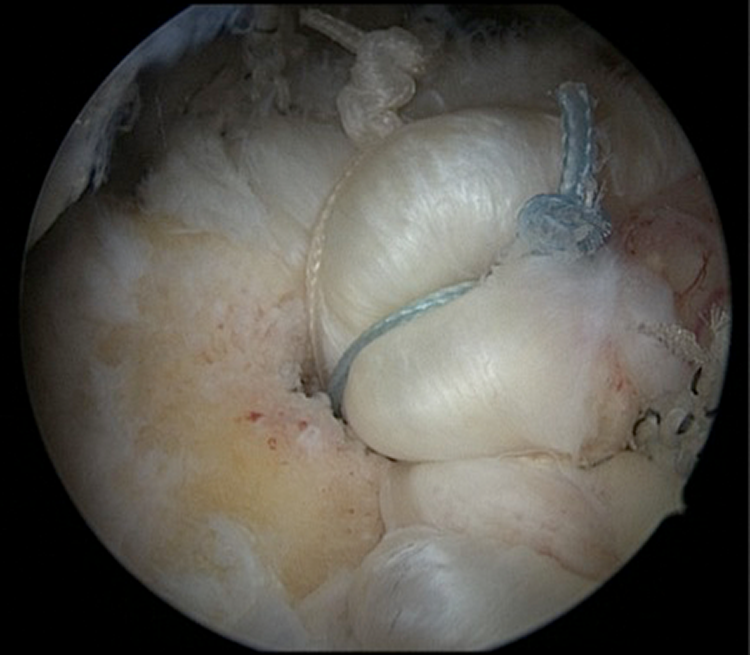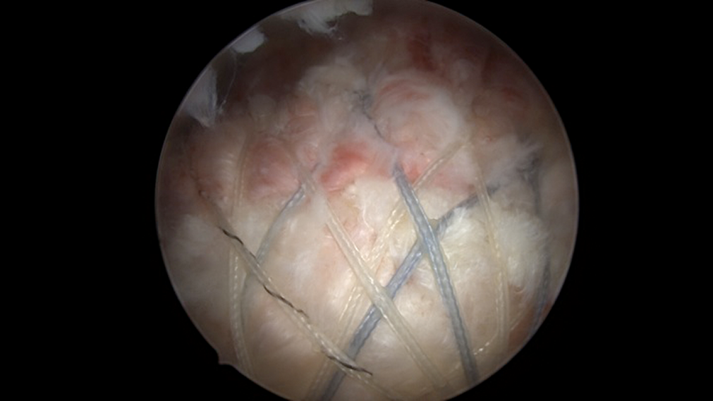Arthroscopic single-row rotator cuff repair with triple-loaded anchors and simple stitches in which 3 sutures (blue, white, and striped) can be seen originating from the same anchor.