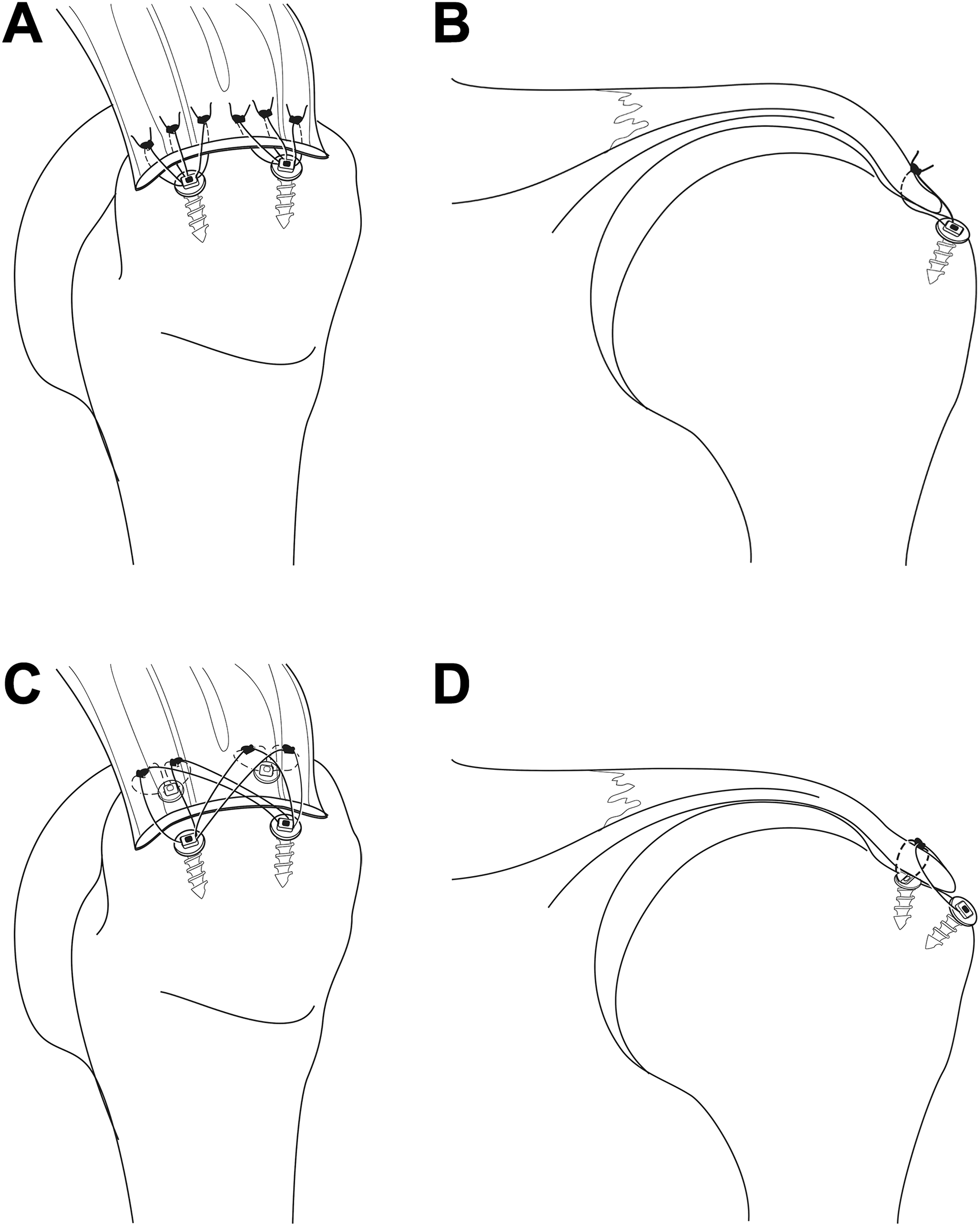 These schematics demonstrate the single-row repair as viewed from the (A) lateral and (B) anterior perspectives and the double-row repair as viewed from the (C) lateral and (D) anterior perspectives.