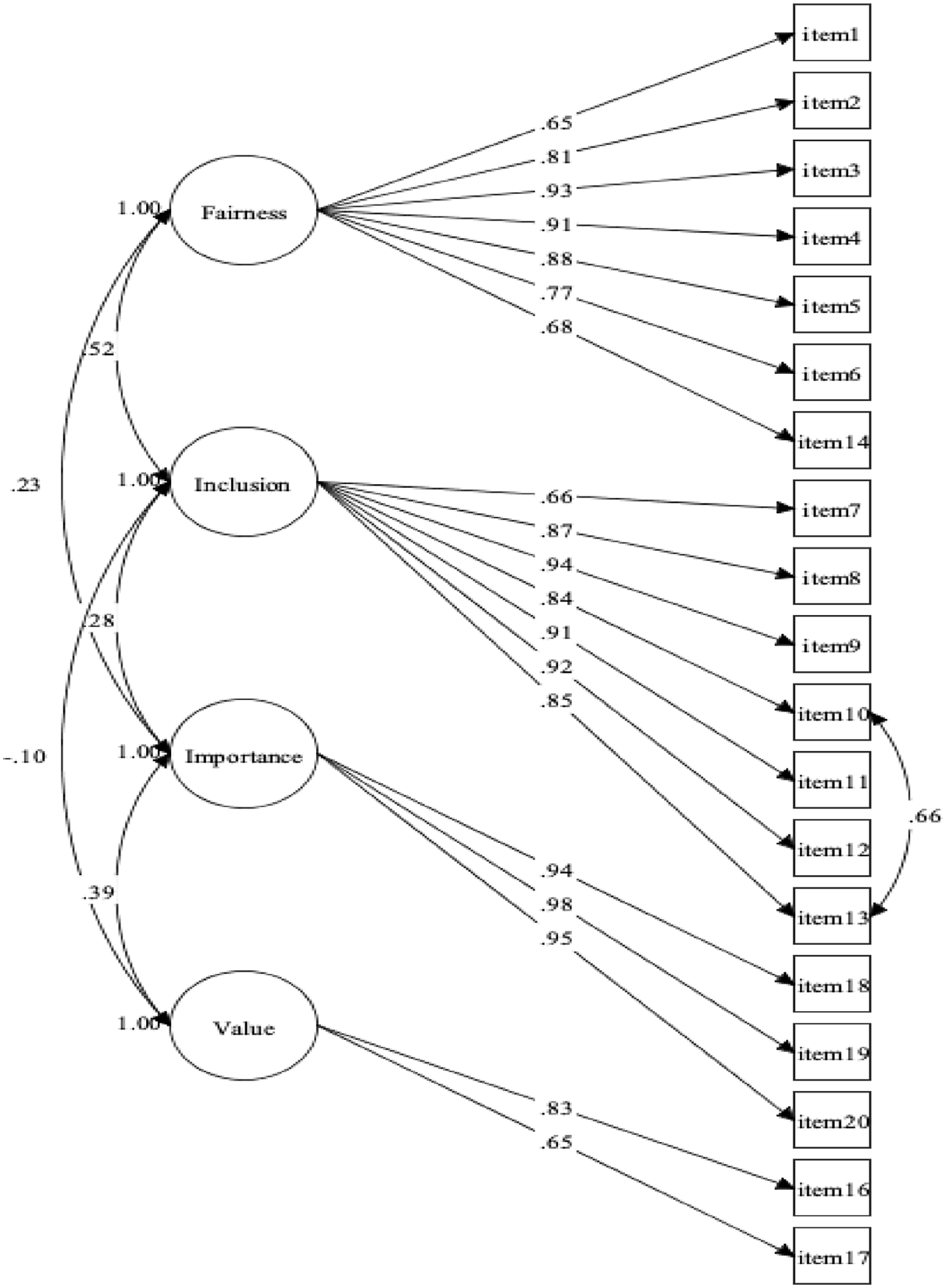 Item 15 (“The university invests insufficient resources (i.e., people and money) on diversity awareness and related training”), Item 21 (“I feel at ease with people from different backgrounds other than my own”), Item 22(“ I am afraid to disagree with members of other groups for fear of being prejudiced”), and Item 23 (“ The lack of diversity keep some faculty/ staff teams from performing to their maximum effectiveness”) were inadequate for explaining the related constructs. Therefore, we suggest excluding these three items when DCS was used to measure employees’ perceptions of diversity climate in IHE settings.