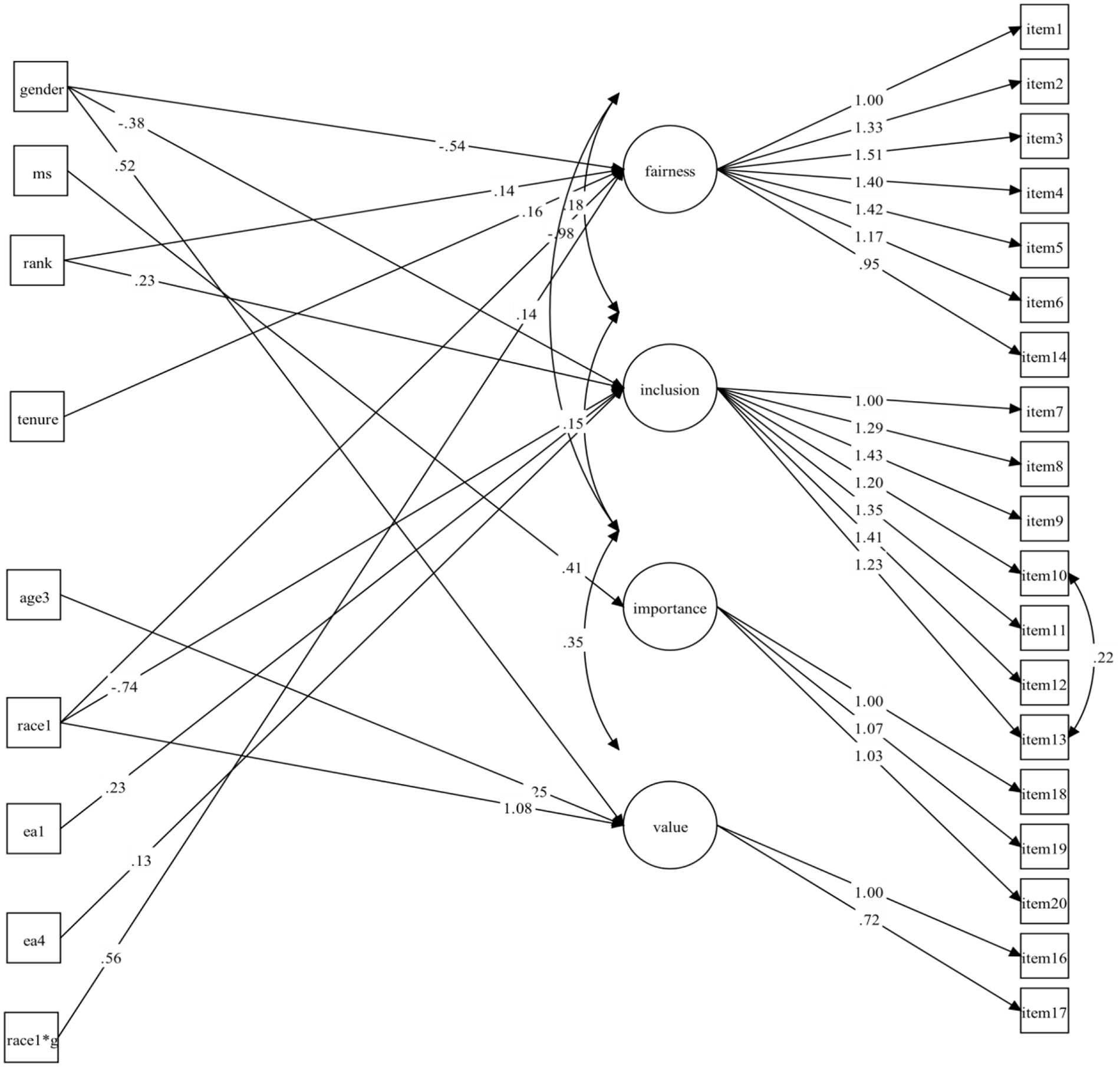 A MIMIC Model explored how engineering faculty’ demographic information, as well as the interaction between gender and race, is associated with the four latent variables underlying the DCS (i.e.,