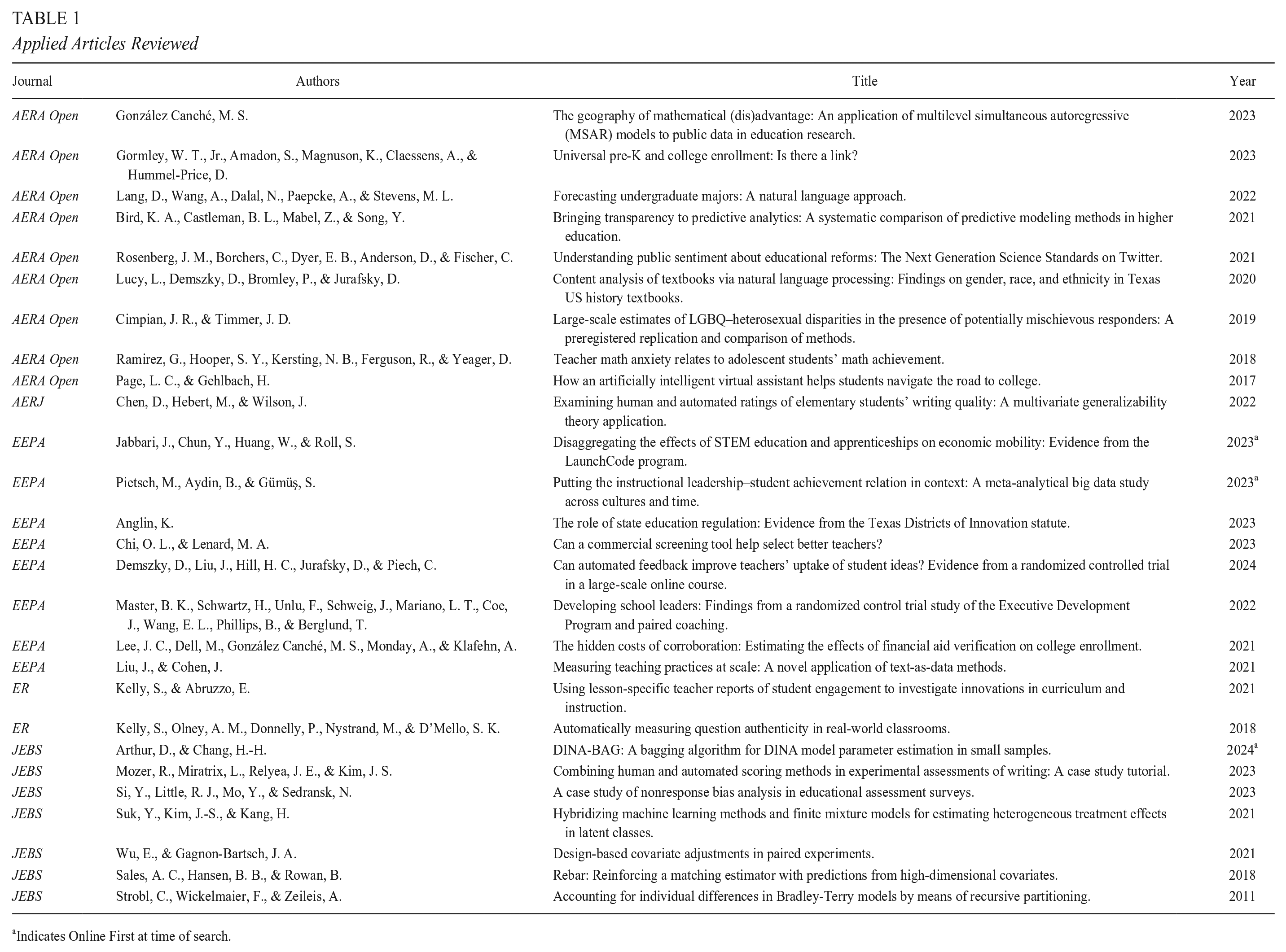 Nevertheless, prediction can be used in the service of causal inference. Three common scenarios were identified from the reviewed literature. First, supervised learning algorithms may be used to measure outcomes or characterize treatments in an evaluation framework (as in Anglin, 2024; Harper et al., 2021; Mozer et al., 2023). Second, supervised learning algorithms may be used to build causal theory, particularly surrounding moderators, or to estimate heterogeneous treatment effects (as in Master et al., 2022; Pietsch et al., 2023; Suk & Han, 2024). Third, supervised learning algorithms are increasingly being used to identify and control for confounds (as in Gormley et al., 2023; Jabbari et al., 2023; Keller, 2020).