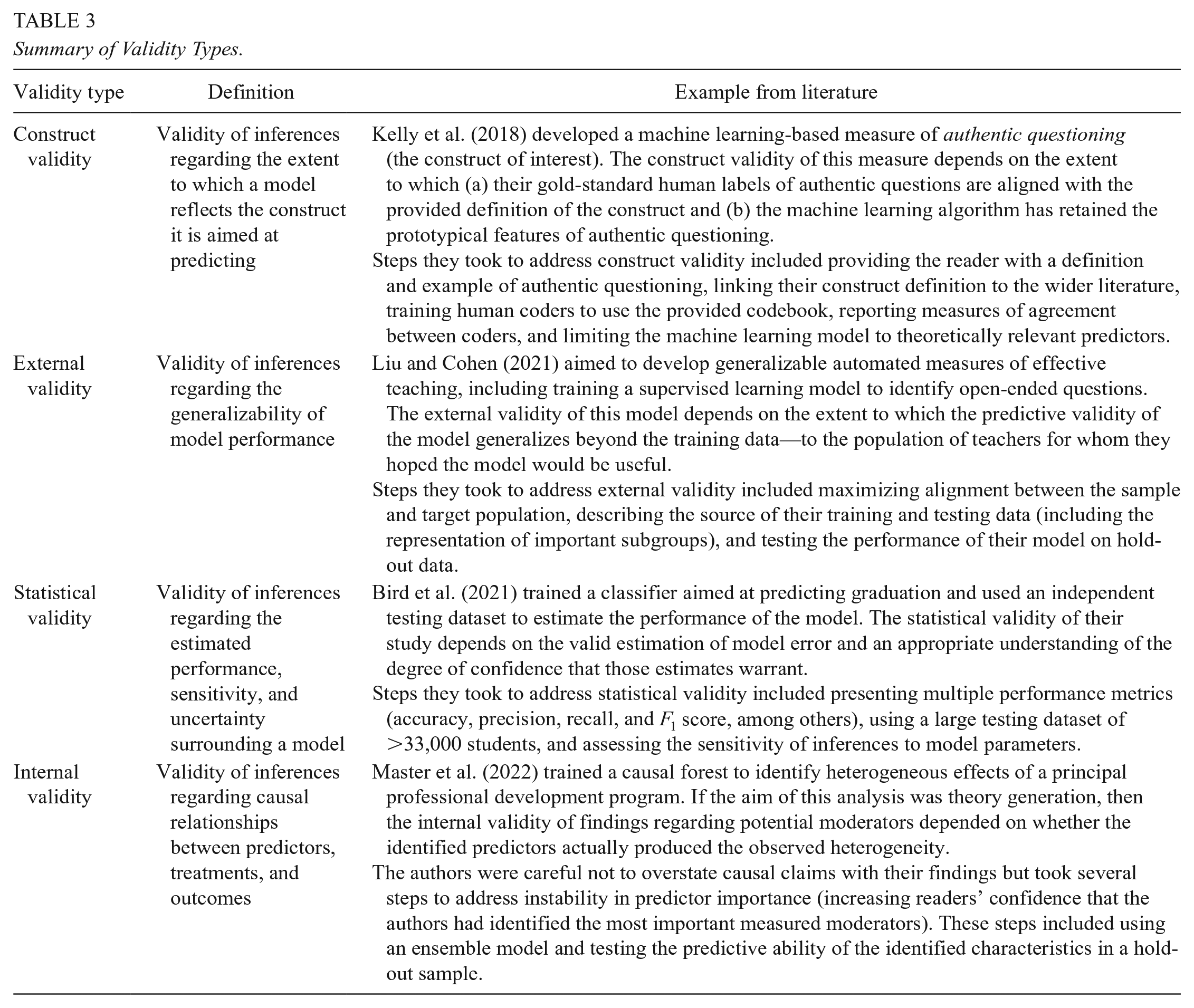 The following sections discuss each validity type in turn—construct, external, statistical, and internal—within a supervised learning context. Each of these sections describes threats to validity and outlines common methodological approaches to addressing those threats. A summary of the validity types, alongside illustrative examples, can be found in Table 3. Then, drawing on the identified threats and best practices, the article concludes with a presentation of a research protocol: a series of questions for researchers and reviewers to consider when conducting and evaluating supervised learning applications in education.